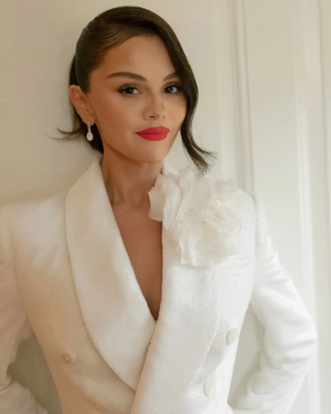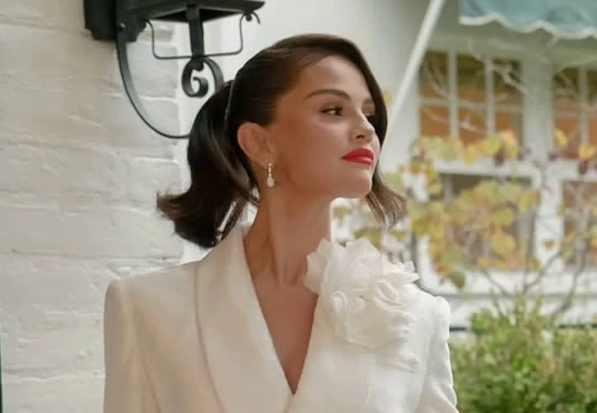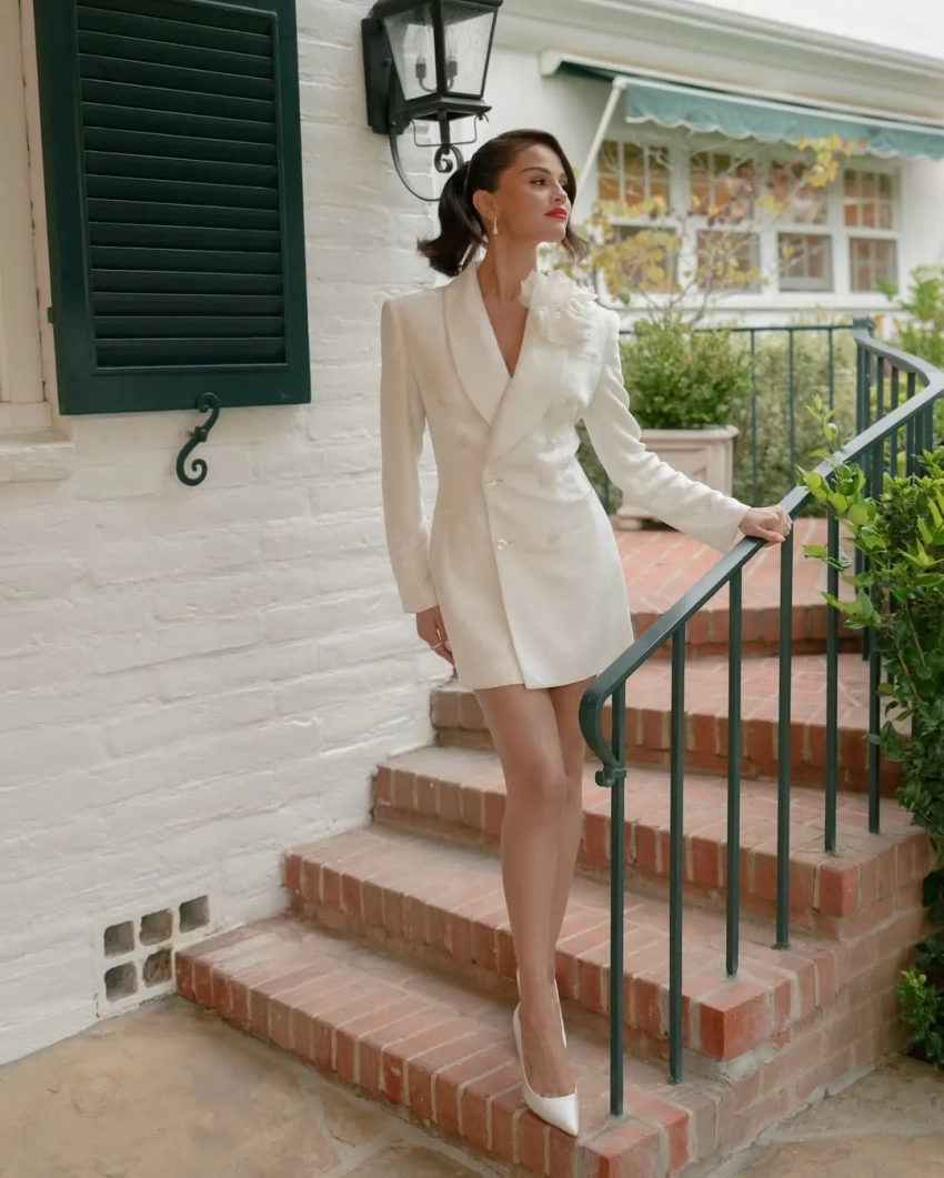 В подборку вошли снимки с репетиции торжества, которые до этого не были обнародованы. Оказалось, что в тот день 33-летняя Селена нарядилась в короткое двубортное платье-блейзер белого цвета. Украшали его объёмный белый цветок на левом лацкане, перламутровые пуговицы и шнуровка на спине. Волосы артистки были уложены в завитой хвост, также образ дополняли ярко-красная помада, серьги и туфли-лодочки.