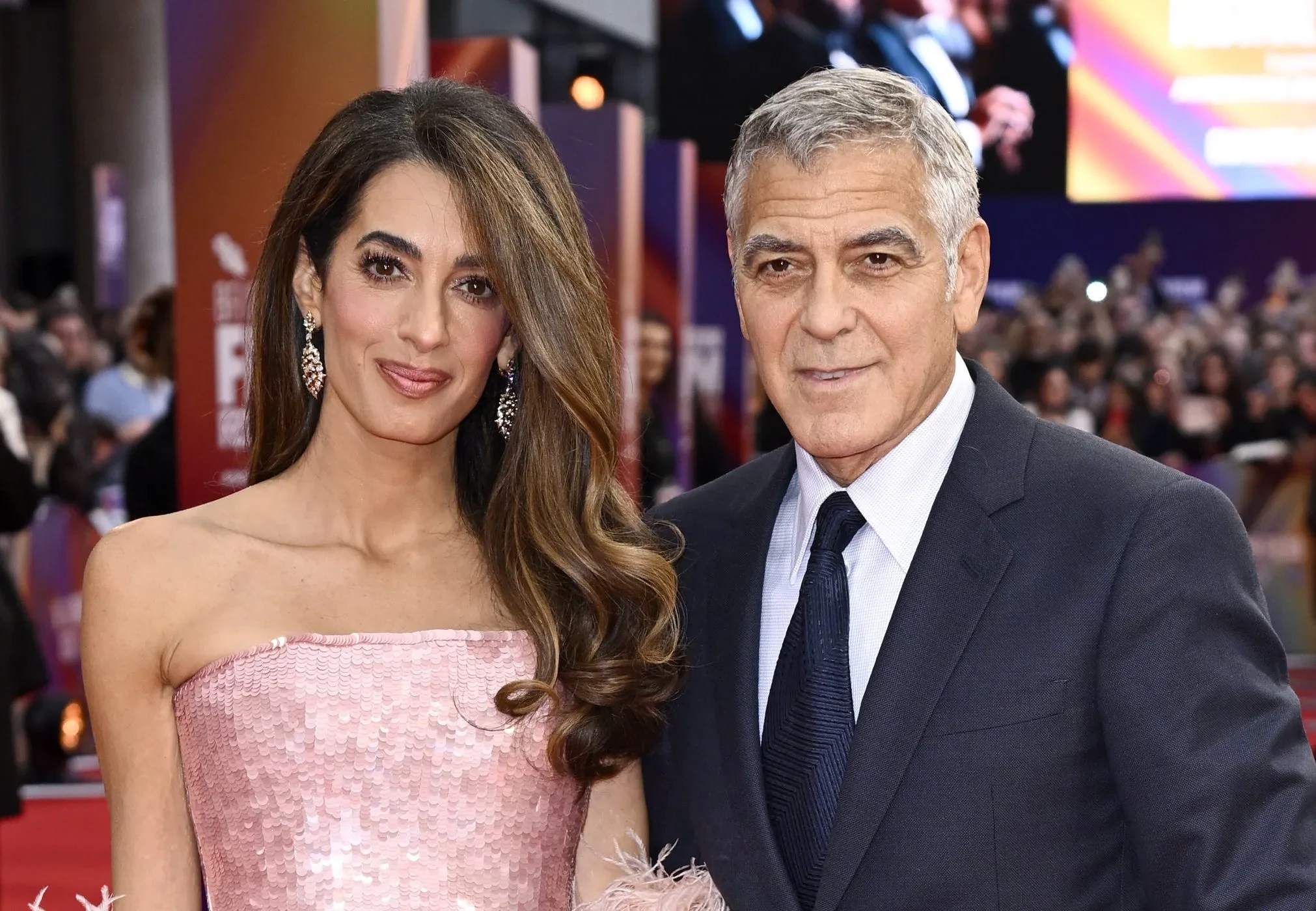 64-летний Джордж Клуни вышел на красную дорожку в сопровождении своей жены, 47-летней Амаль Клуни, которая выбрала для мероприятия розовое платье Tamara Ralph, украшенное пайетками на лифе и бахромой на подоле.