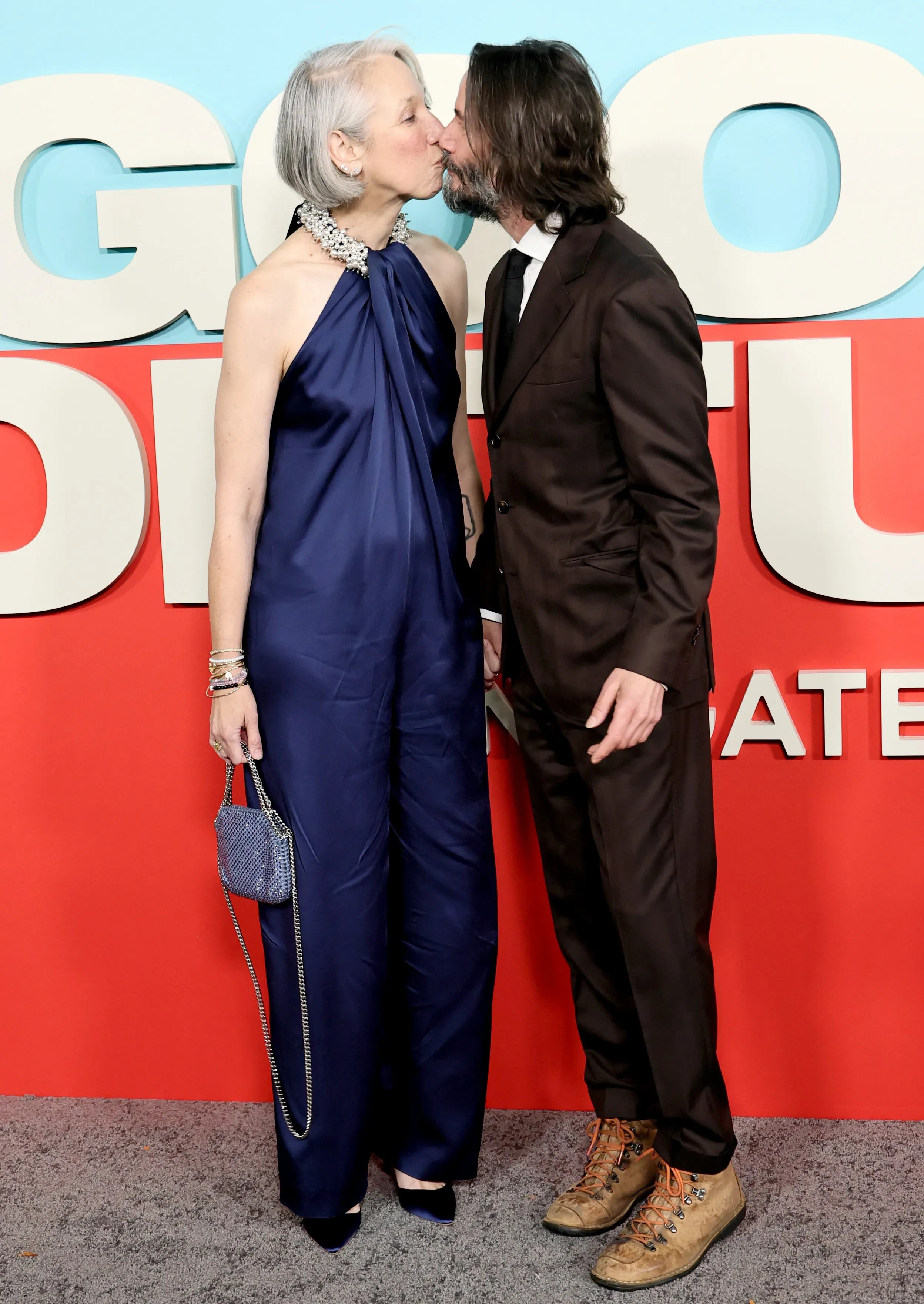 Киану надел на премьеру коричневый костюм с галстуком и свои любимые ботинки, а его 52-летняя девушка позировала рядом в синем шёлковом комбинезоне и туфлях на каблуках. Актёр и художница не стеснялись внимания фотографов: они держались за руки и целовались.