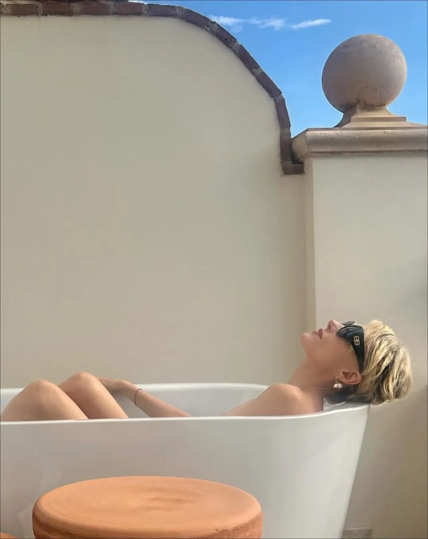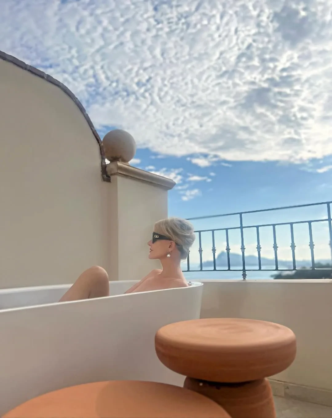 Ванна, судя по всему, установлена на балконе апартаментов, так что на фоне можно увидеть небо и море. “Каникулы перед гастролями”, — подписала снимки актриса.