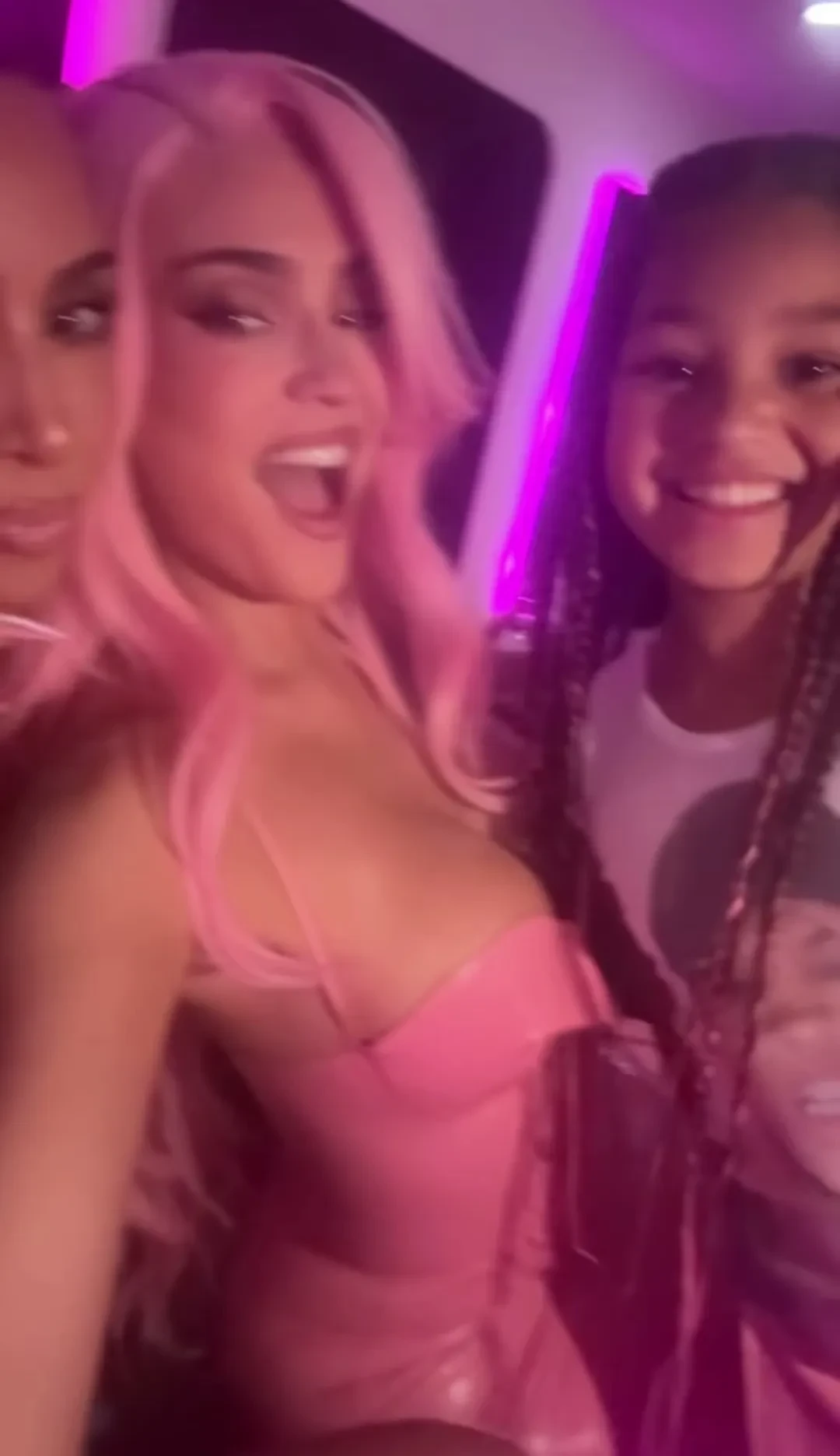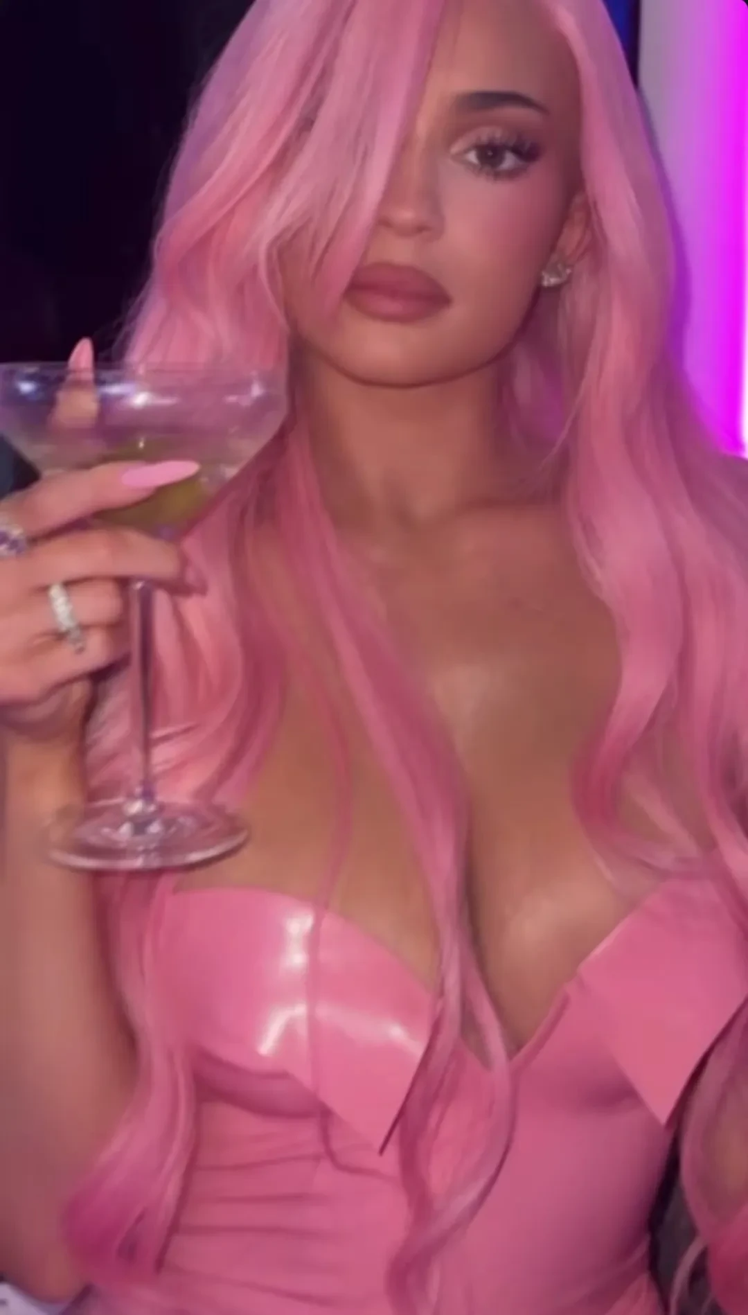 https://t.me/spletnik2006/42149На вечеринку, проходившую в Лос-Анджелесе, Кайли нарядилась в обтягивающее розовое латексное платье. Образ дополняли розовый парик, розовый маникюр и розовые туфли на каблуках. Семилетняя дочь Дженнер, которую та взяла с собой на праздник, была одета в тон. На Сторми были розовые латексный блейзер и юбка, а также футболка с изображением лица её мамы.