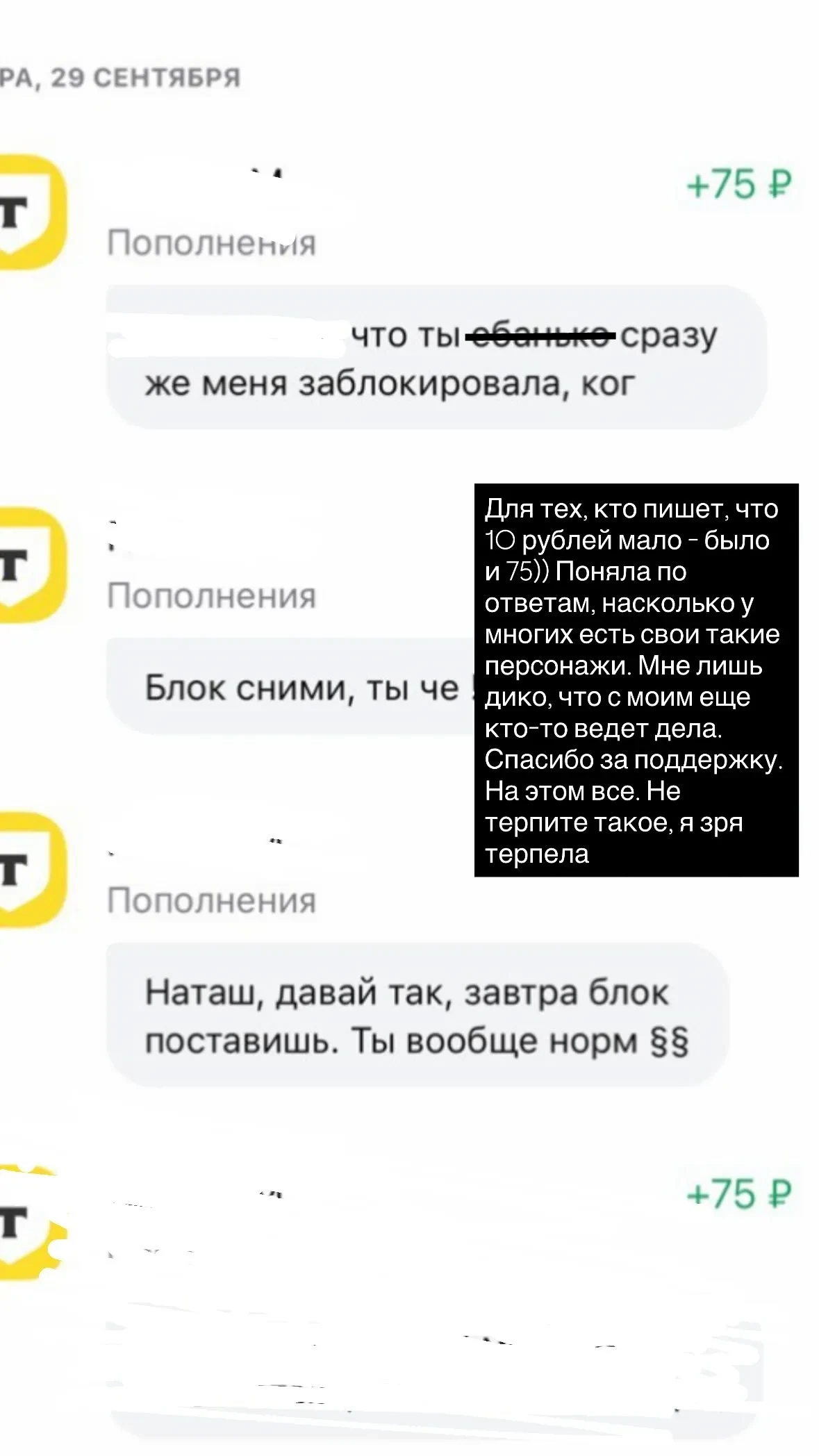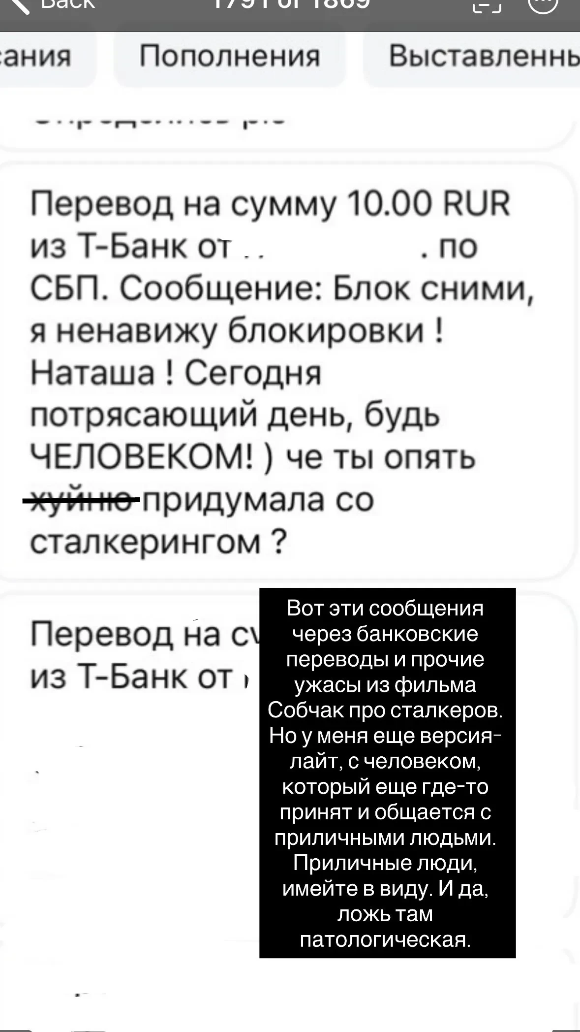 Наталия АрхангельскаяСторис* Наталии АрхангельскойНавязчивого поклонника Архангельская, судя по всему, в итоге заблокировала, однако он продолжает искать способы связаться с ней, в том числе переводит небольшие суммы денег, пытаясь привлечь внимание. Журналистка подчеркнула, что этот человек известен в определённых кругах и "общается с приличными людьми". "Приличные люди, имейте в виду. И да, ложь там патологическая", — добавила Наталия.