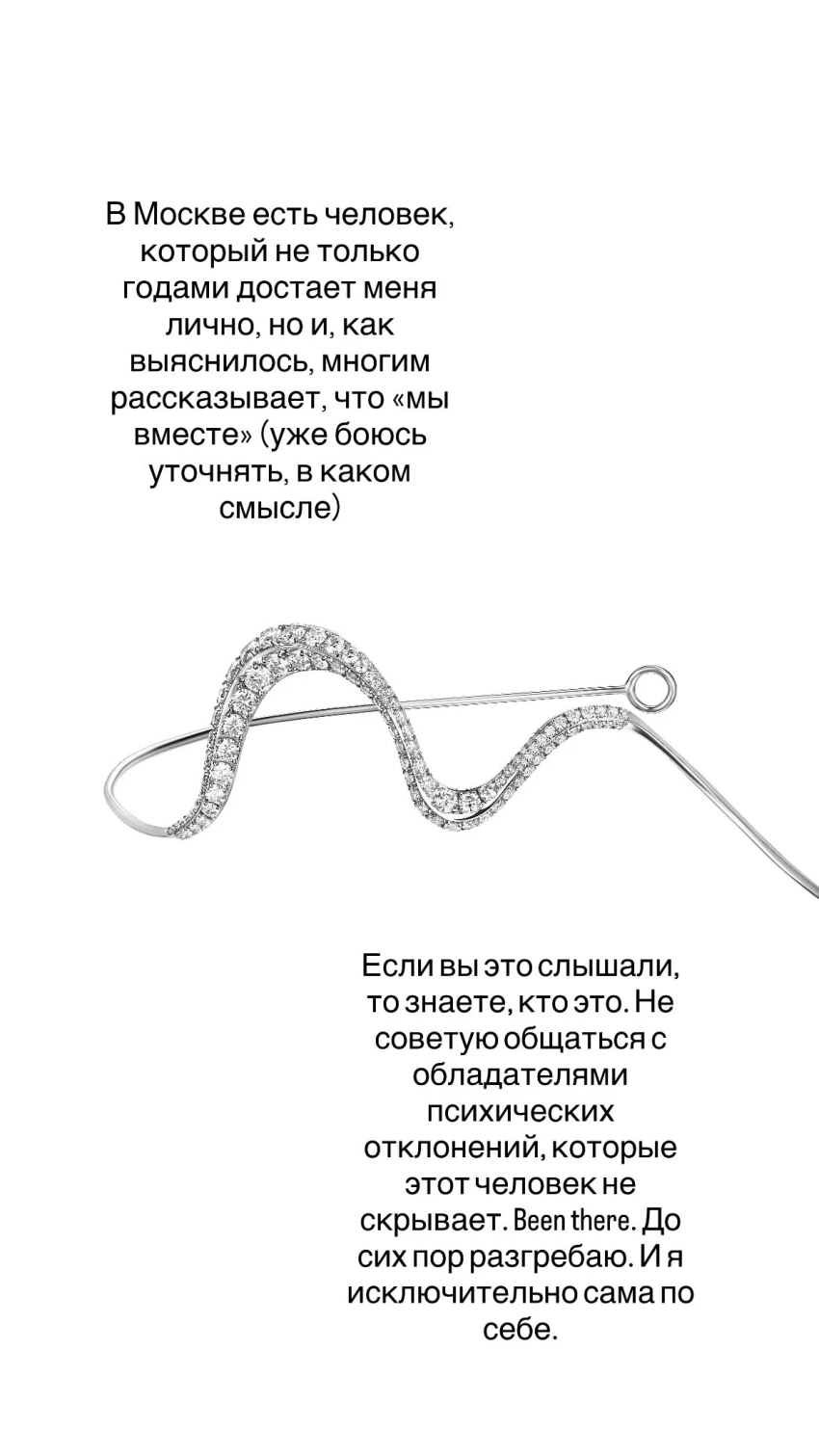 По словам Наталии, ещё несколько лет назад некий человек из Москвы начал проявлять к ней чрезмерный интерес. Кроме того, к своему удивлению, она лишь недавно узнала, что сталкер ещё и публично рассказывает о том, что "они вместе". "Если вы это слышали, то знаете, кто это. Не советую общаться с обладателями психических отклонений, которые этот человек не скрывает. Been there. До сих пор разгребаю. И я исключительно сама по себе", — написала она.