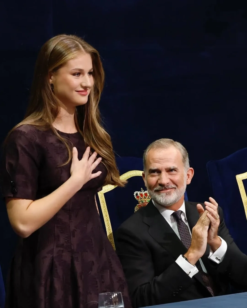 Королева Летиция с мужем и дочерьмиКоролева Летиция с мужем и дочерьмиКоролева Летиция с мужем и дочерьмиКоролева Летиция с мужем и дочерьмиКоролева Летиция с мужем и дочерьмиКоролева Летиция и инфанта СофияКоролева Летиция с мужем и дочерьмиПринцесса ЛеонорПринцесса Леонор с отцомКоролева Летиция с мужем и дочерьмиА вечером того же дня все собрались на торжественной части церемонии в театре Кампоамор. Королева Летиция выбрала для мероприятия чёрное вечернее платье, а Леонор и София пришли в тёмно-коричневом и бордовом нарядах соответственно.