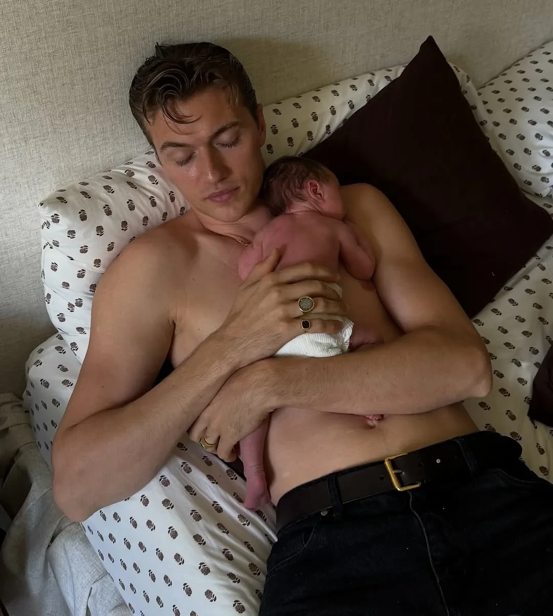 На снимке блогерша держит новорождённую дочь, стоя перед зеркалом. При этом её штаны приспущены, а кофта расстёгнута на несколько пуговиц: таким образом Нара продемонстрировала подписчикам, как быстро она пришла в форму после родов.