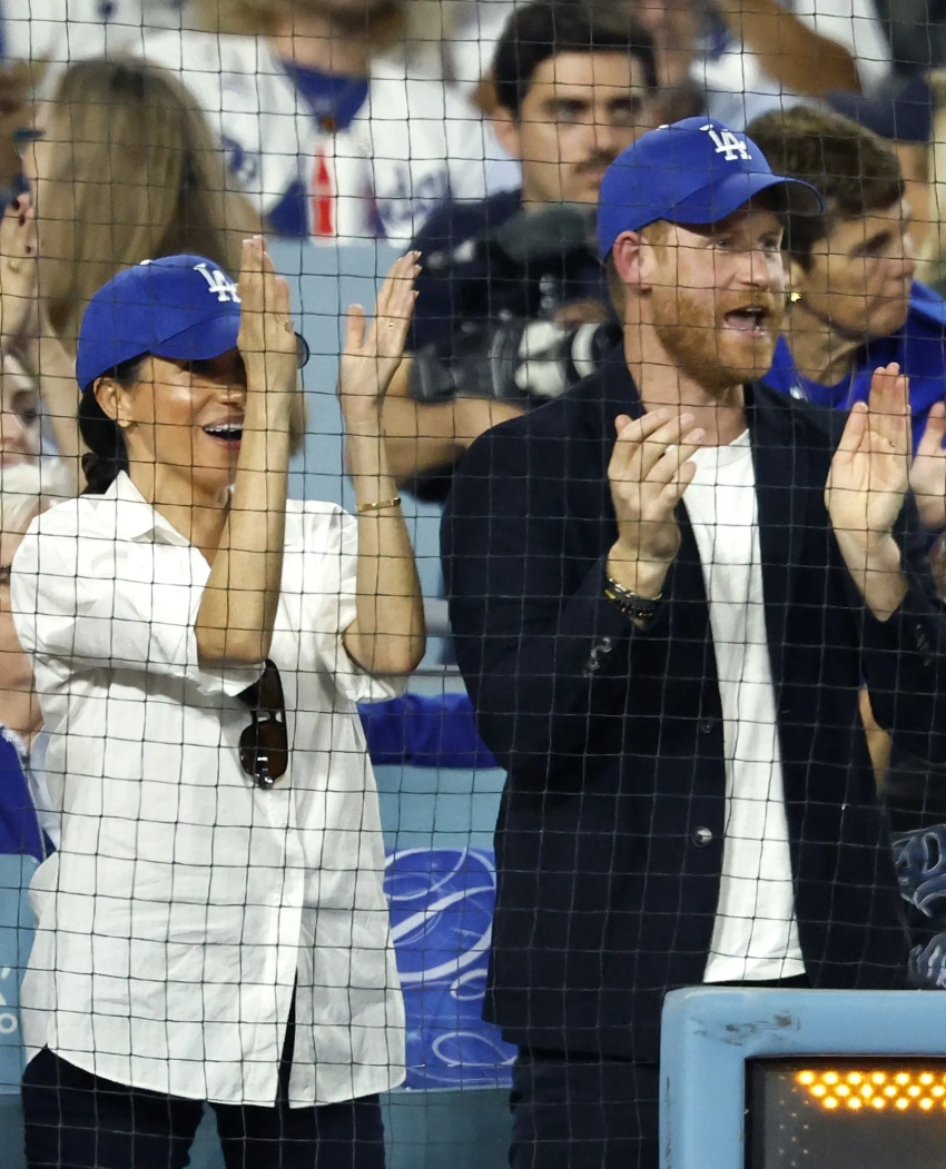 44-летняя Меган Маркл пришла на игру в белой рубашке и чёрных джинсах, а 41-летний Гарри надел белую футболку с чёрным пиджаком. Супруги надели также одинаковые кепки в цветах команды Los Angeles Dodgers, за которую они болели.