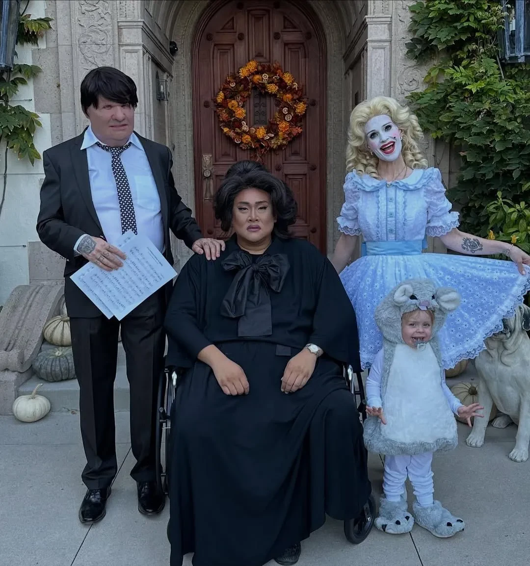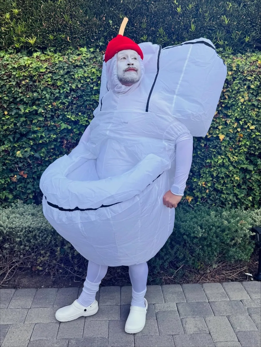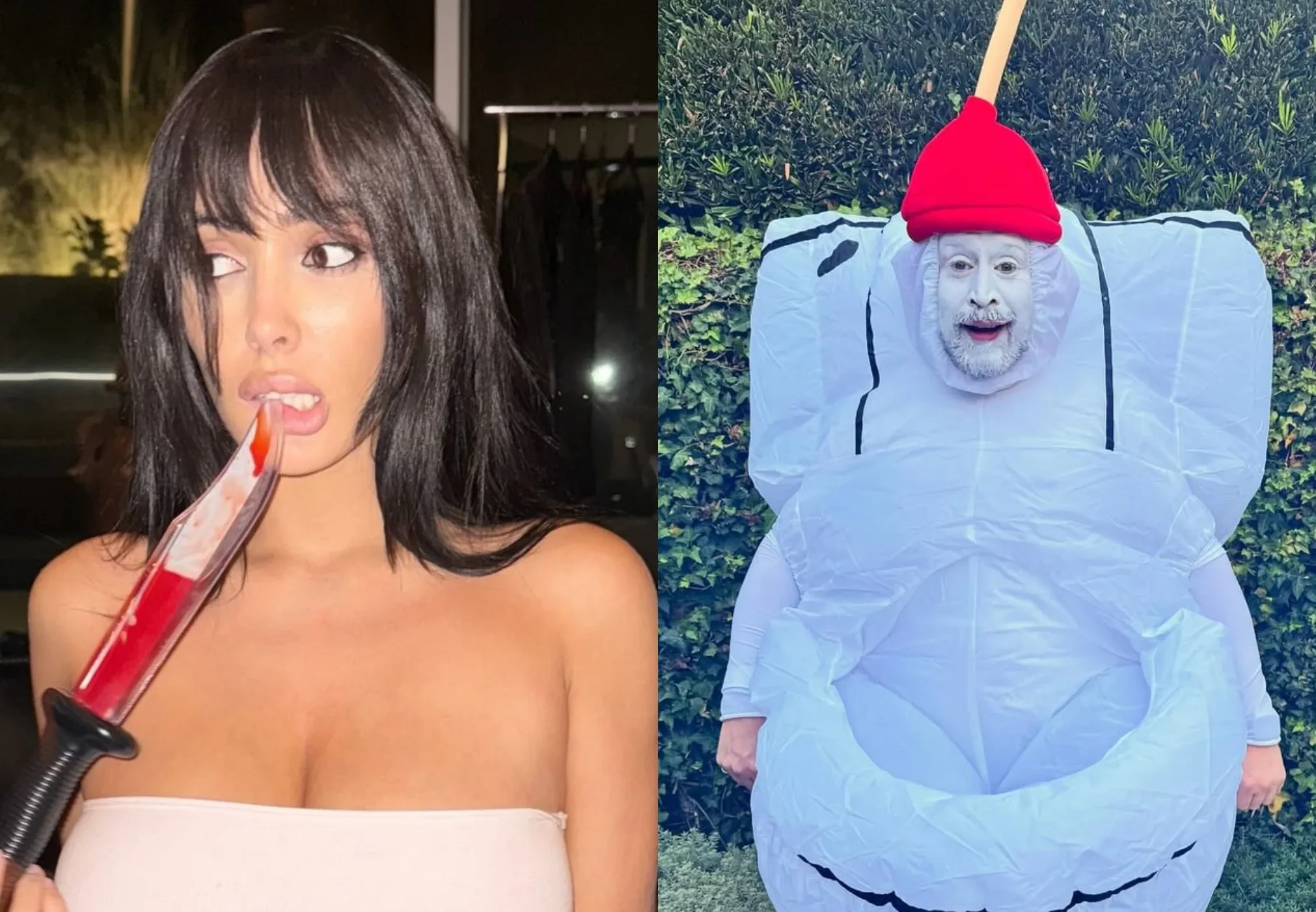 Звезда картины "Один дома" Маколей Калкин по просьбе своих детей в этом году примерил костюм унитаза. Дочь Оззи Осборна Келли вместе с мужем Сидом Уилсоном и другом семьи воплотили сцены из хоррора "Что случилось с Бэби Джейн?", а Энн Хэтэуэй повторила образ Розалии с обложки её альбома Motomami.