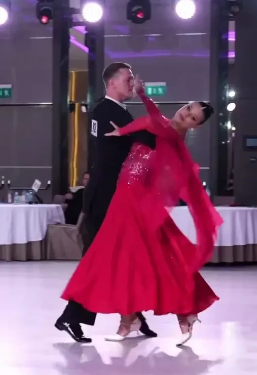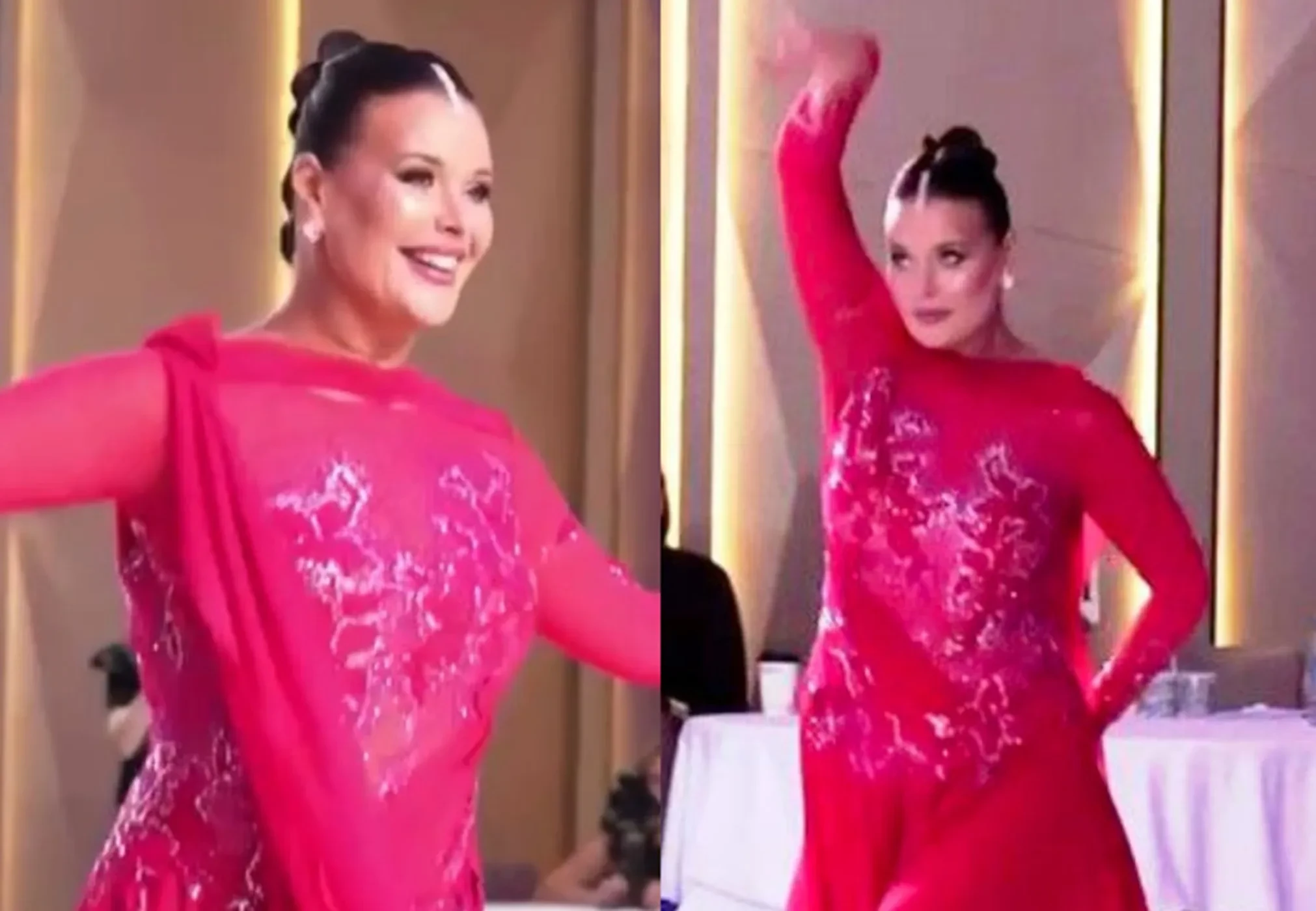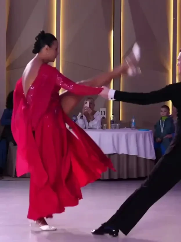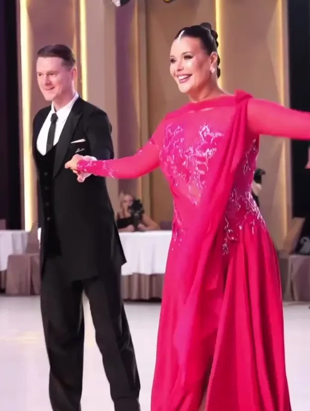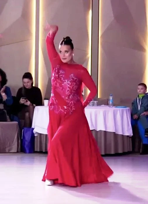 Одетая в красное платье с разрезами Фёдорова исполнила несколько танцев с партнёром. В итоге они даже завоевали первое место в одной из категорий.