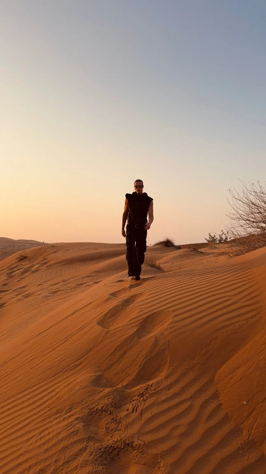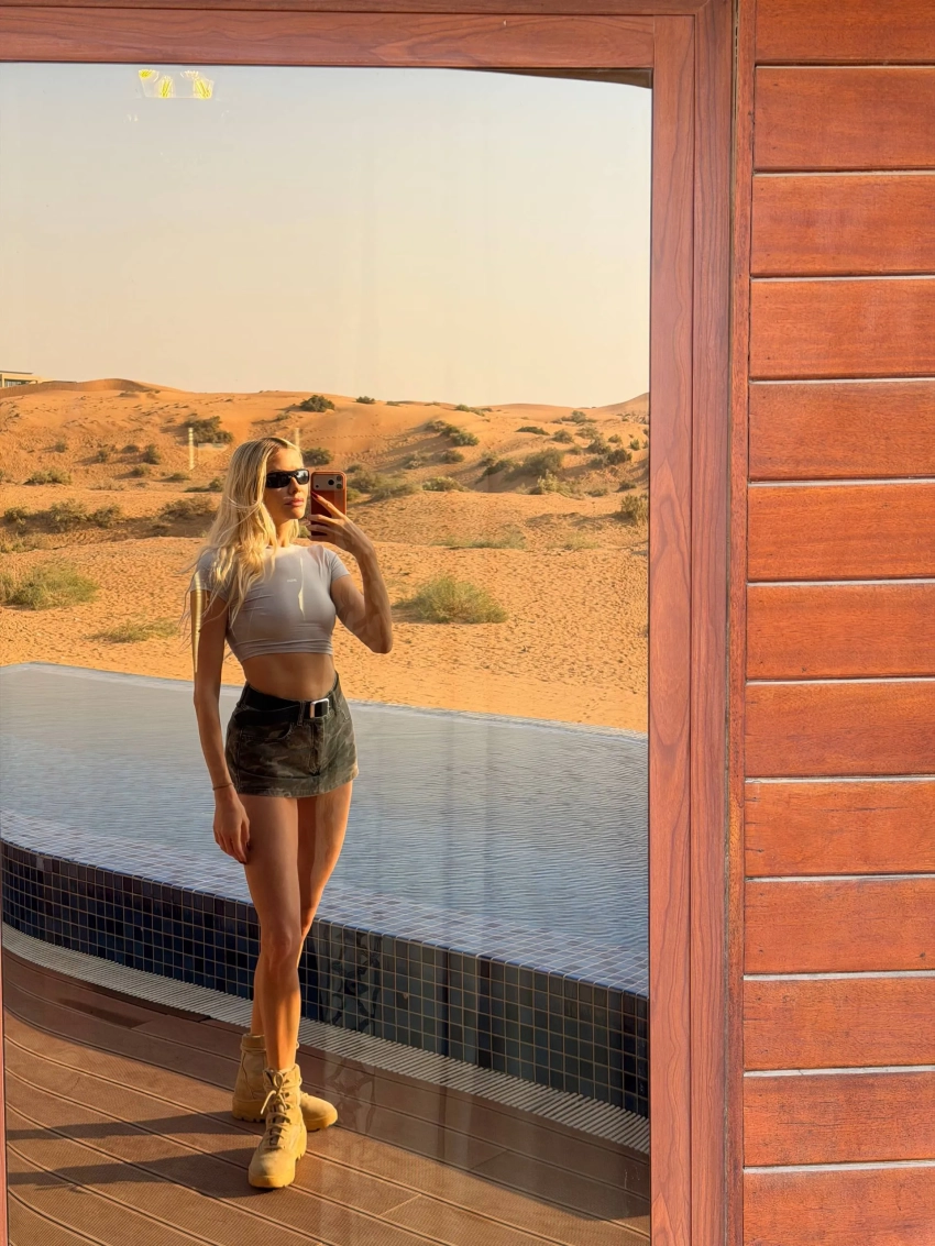 Похоже, влюблённые поселились в домике прямо в пустыне. Они сразу отправились рассекать по дюнам на багги и встречать закат. Чтобы прочувствовать местную атмосферу, Перминова также сделала роспись мехенди.