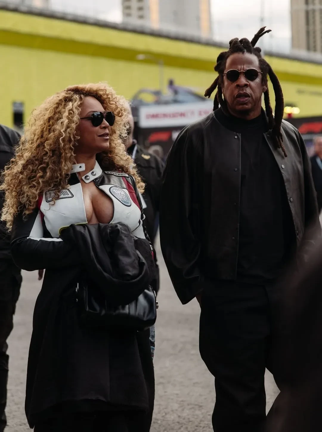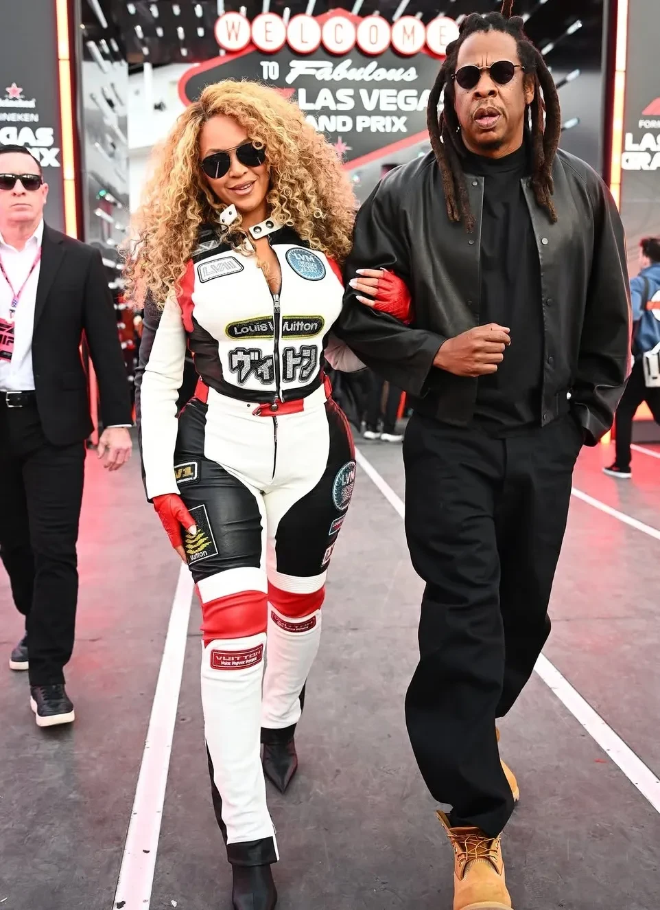 44-летняя Бейонсе пришла в кожаном мотокостюме Louis Vuitton с декольте и вместе с гонщиком Льюисом Хэмилтоном прокатилась на красном автомобиле Ferrari. А 55-летняя Наоми Кэмпбелл позировала на соревнованиях в тренче со змеиным принтом и солнцезащитных очках.