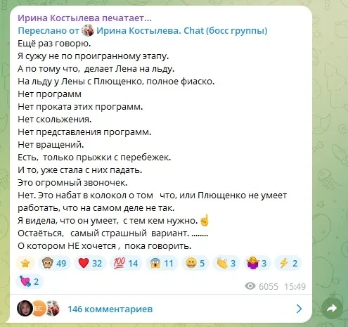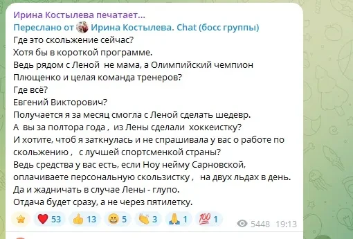 Скриншот из телеграм-канала Ирины КостылевойВ ответ Плющенко написал, что "долго молчал" (известно, что Ирина и прежде делала публичные нападки на тренера), и призвал не верить её словам. Он заявил, что тренерский штаб бережёт Елену на фоне травмы, и рассказал о жёстких методах воспитания в семье Костылевых. Он также совершил демонстративный жест, подарив перед камерами Лене iPhone, чтобы она всегда "была с ним на связи" (ранее он заявил, что мать забирает телефон у дочери).