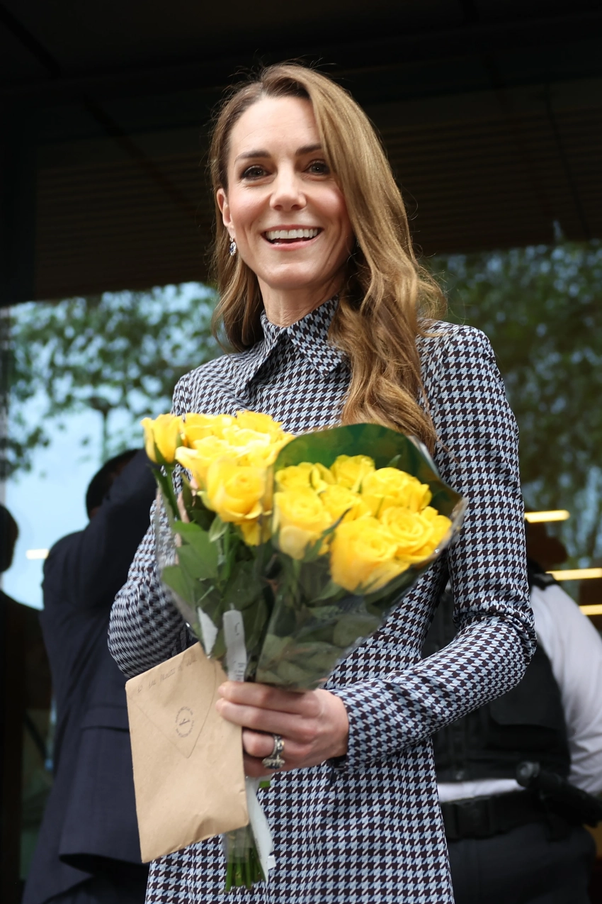 43-летняя Кейт Миддлтон выбрала для выхода платье с принтом "гусиная лапка" от Emilia Wickstead, туфли на каблуке Boss и сумку De Mellier.