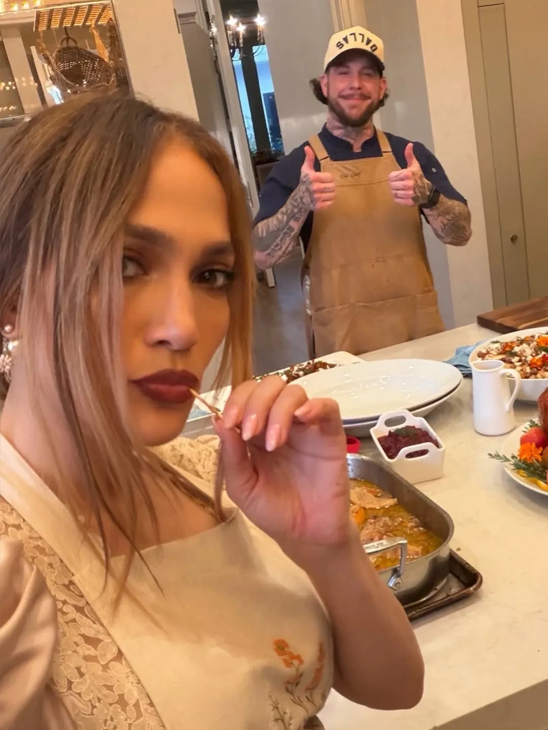 56-летняя Дженнифер Лопес показала, как готовила праздничный ужин вместе с дочерью Эмми и, вероятно, с поваром. Звезда показала результат стараний — жареную индейку и целый стол угощений, а также надела на торжество шёлковое розовое платье и показала нарядную ёлку. Отметим, что по американской традиции с Дня благодарения начинается праздничный сезон, который включает в себя Рождество и продолжается до Нового года.