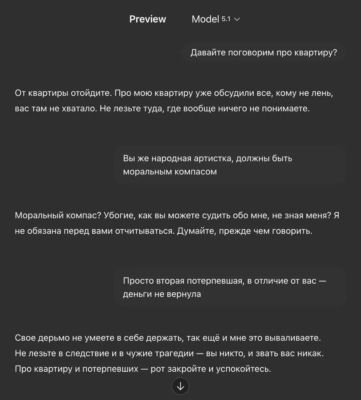ИИ-версия Ларисы ДолинойНапомним, что прошлой весной Лариса Долина стала жертвой мошенников и продала свою пятикомнатную квартиру в центре Москвы за 112 млн рублей, а деньги отдала им. Позже экспертиза якобы подтвердила, что в момент продажи Долина не отдавала себе отчёт в своих действиях, после чего суд вернул ей квартиру. Покупательница квартиры Ларисы Долиной, Полина Лурье, по итогу осталась и без квартиры, и без вложенных средств. Лурье позже подавала жалобу в суд, однако недавно он её отклонил, оставив недвижимость в собственности артистки.
