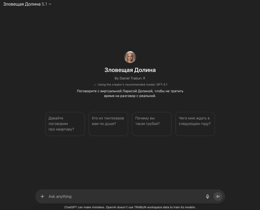 Мем про Ларису ДолинуВ сети также создали ИИ-версию Ларисы Долиной, которая может ответить на любой вопрос, в том числе и про свою квартиру.