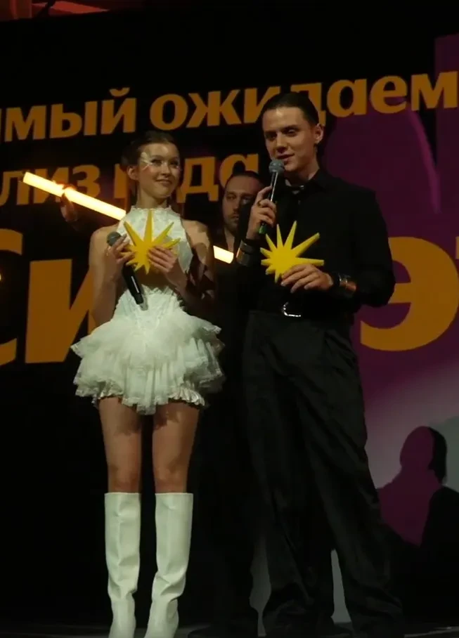 16-летняя актриса вышла под камеры в коротком белом "платье невесты" и с декоративными крылышками за спиной. Её возлюбленный на контрасте был одет в total black. Пара исполнила со сцены свой хит "Силуэт".