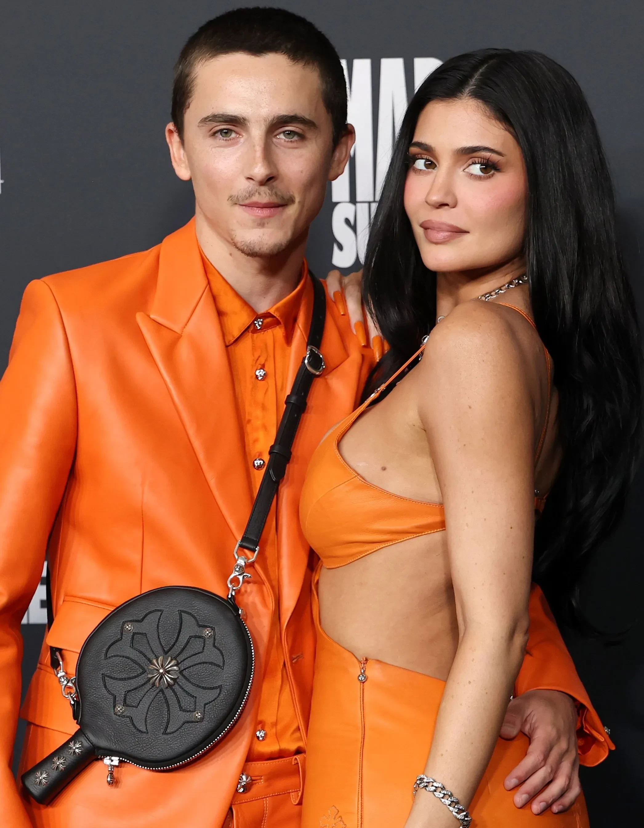 29-летний Шаламе и его возлюбленная позировали в оранжевых парных образах Chrome Hearts. Актёр надел кожаный костюм и сумку в форме ракетки для пинг-понга — это отсылка к роли, которую он играет в фильме. 28-летняя Кайли Дженнер позировала в платье с декольте и открытой спиной.