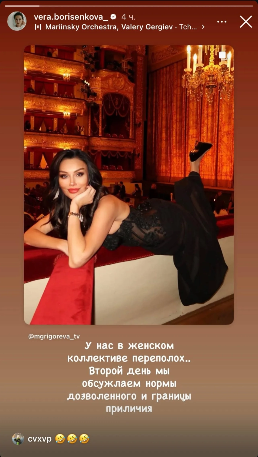 Сторис* Анастасии ВинокурСторис* Веры БорисенковойСтоит отметить, что Большой театр уже давно приобрёл сомнительную репутацию как одно из самых "инстаграмных" мест, особенно любимых селебрити и светскими львицами. Так, например, из-за ежегодного наплыва звёзд на зимние показы балета "Щелкунчик" стоимость билетов стала отдельной темой для скандалов и бурных дискуссий.