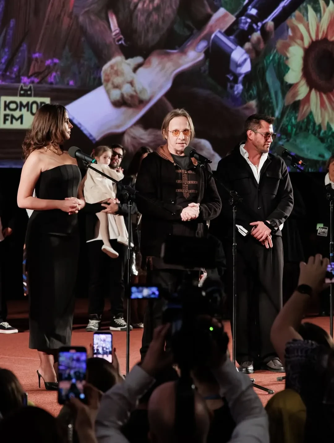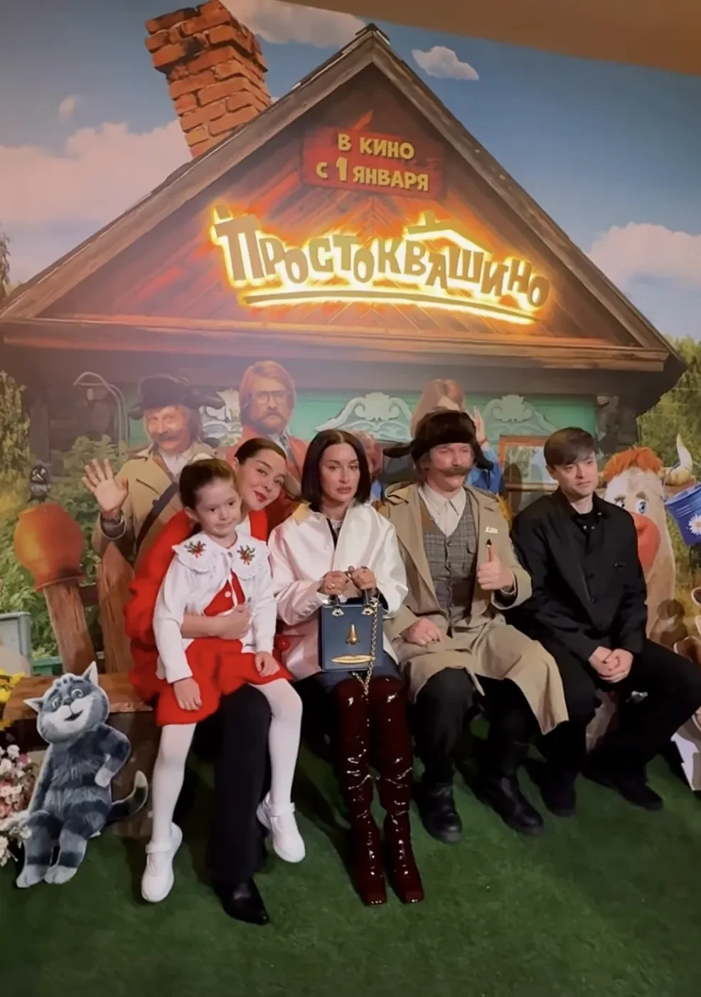 Тина Канделаки, Павел Прилучный, Иван Охлобыстин и Лиза Моряк с дочерьми на премьере фильма "Простоквашино"