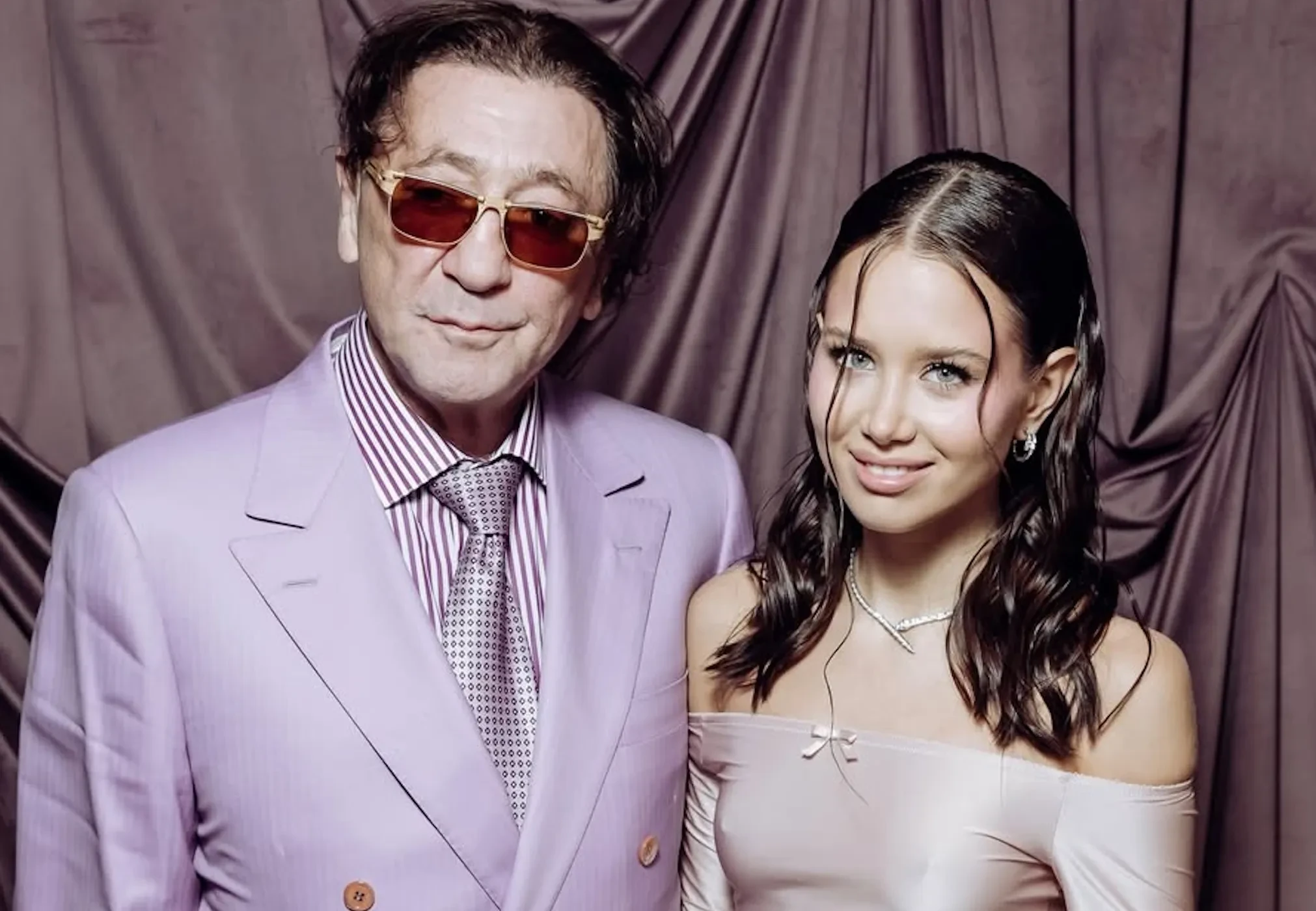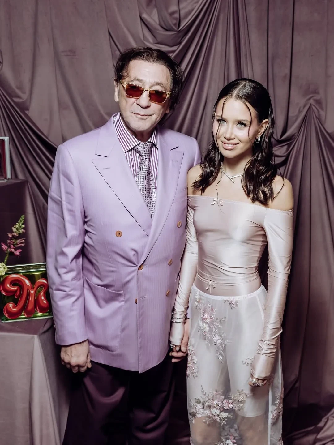 Аврора Киба пришла на мероприятие в розовом образе — в прозрачной юбке с цветочной вышивкой, которую она надела с шортами, и топе с открытыми плечами. Свой наряд она дополнила короткой белой шубой и серебристым клатчем Chanel. Лепс тоже выбрал наряд в розово-лиловых оттенках. Пара вместе позировала фотографам, держась за руки.
