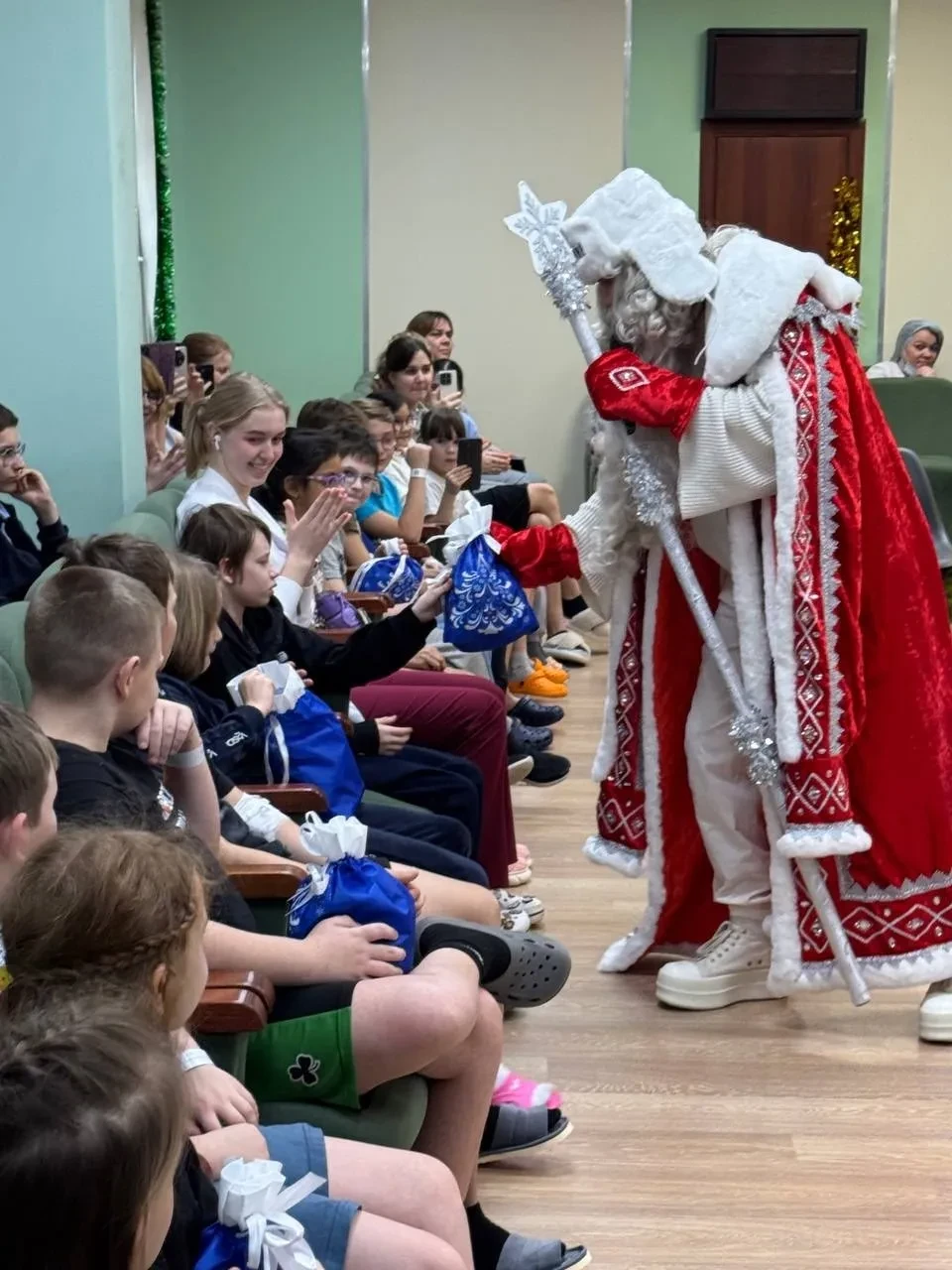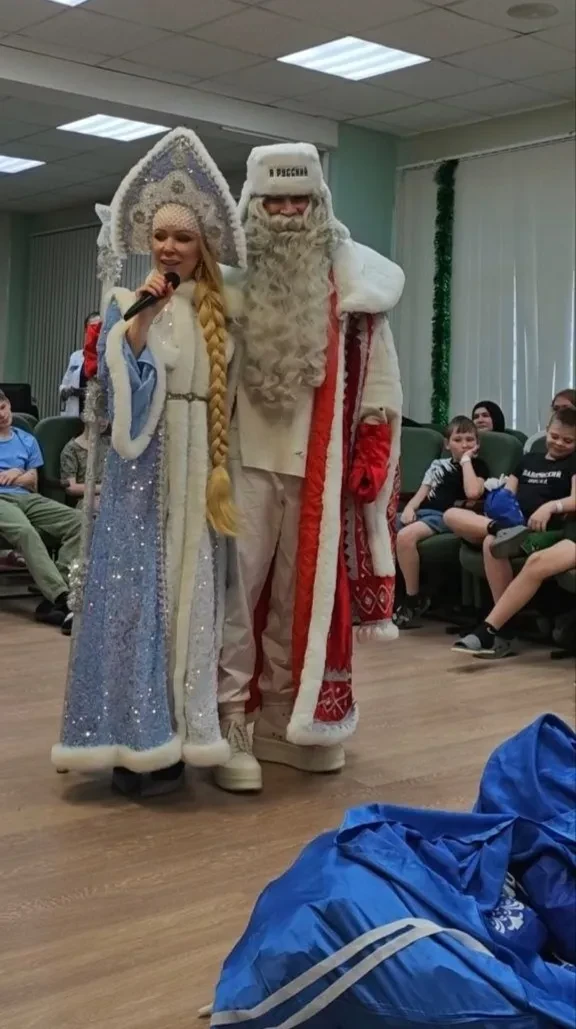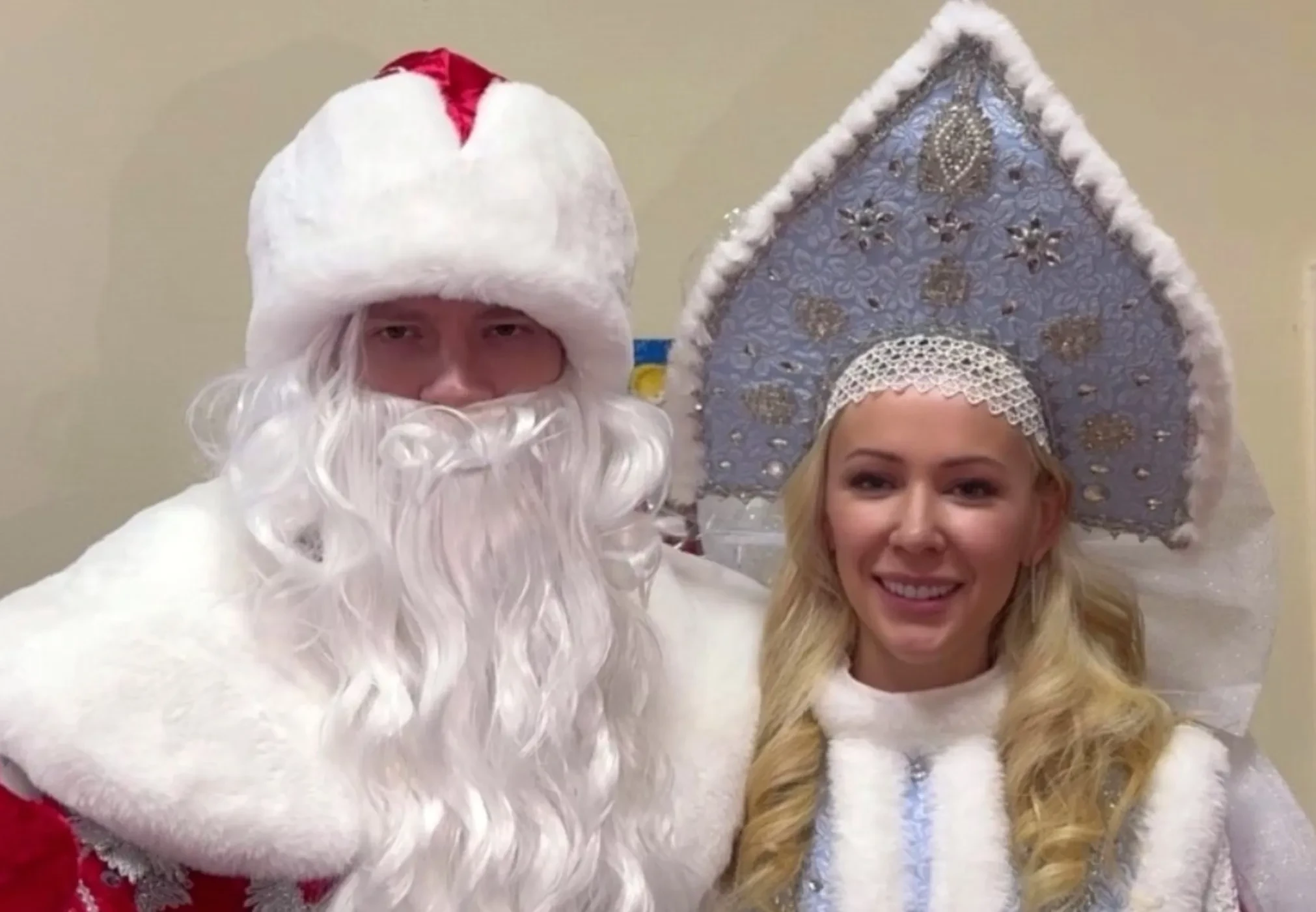 Пара, которая недавно сыграла свадьбу, пришла в образах Деда Мороза и Снегурочки и устроила для детей насыщенную программу: 34-летний певец и 41-летняя глава Лиги безопасного интернета пели с детьми новогодние песни, загадывали загадки и, конечно, подарили всем присутствующим подарки.