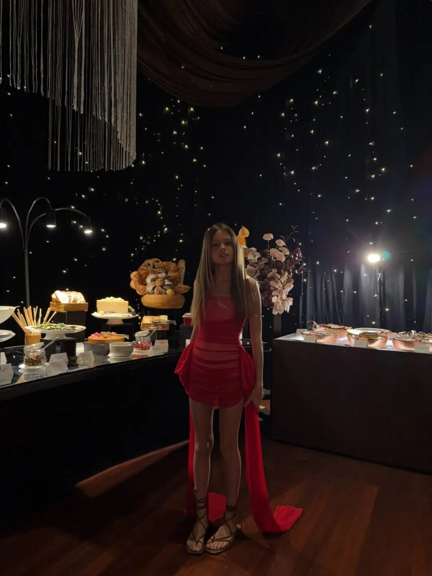 "Наш Новогодний вечер в самом волшебном месте", — написала Елена Перминова. В новогоднюю ночь она выгуляла два образа: платье с золотыми пайетками и прозрачной юбкой и голубое платье с вырезом на бедре. 11-летняя дочь Перминовой Арина уже примеряет наряды матери: она позировала на празднике в красном платье, в котором Елена отмечала свой день рождения в Венеции.