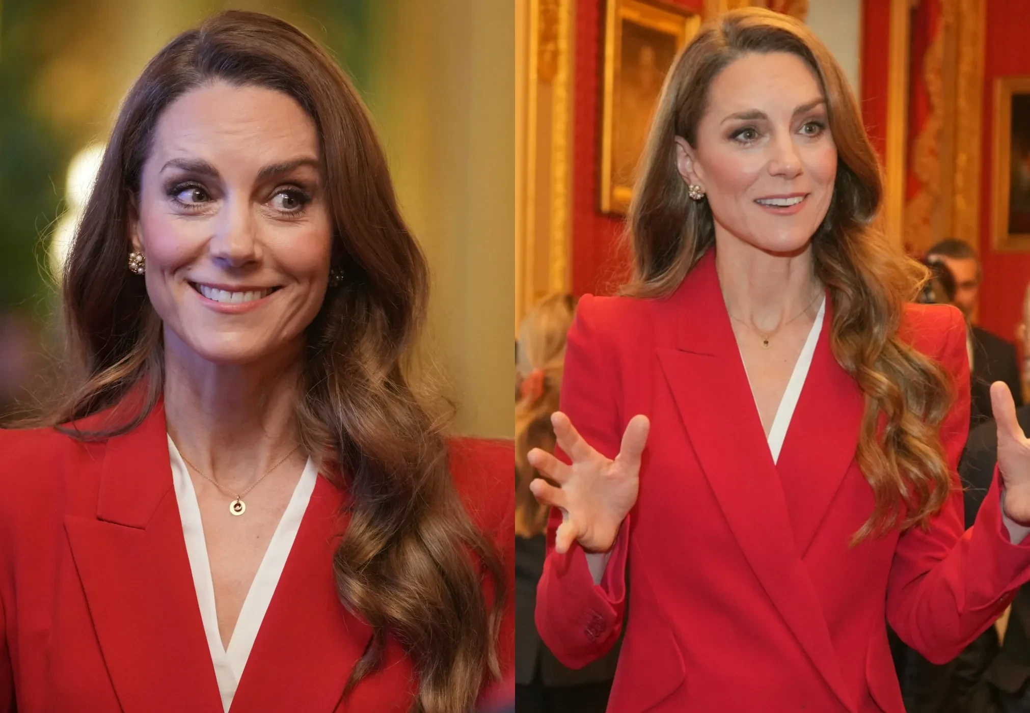 Кейт Миддлтон в красном костюме и с новым цветом волос возглавила первый государственный приём в этом году
