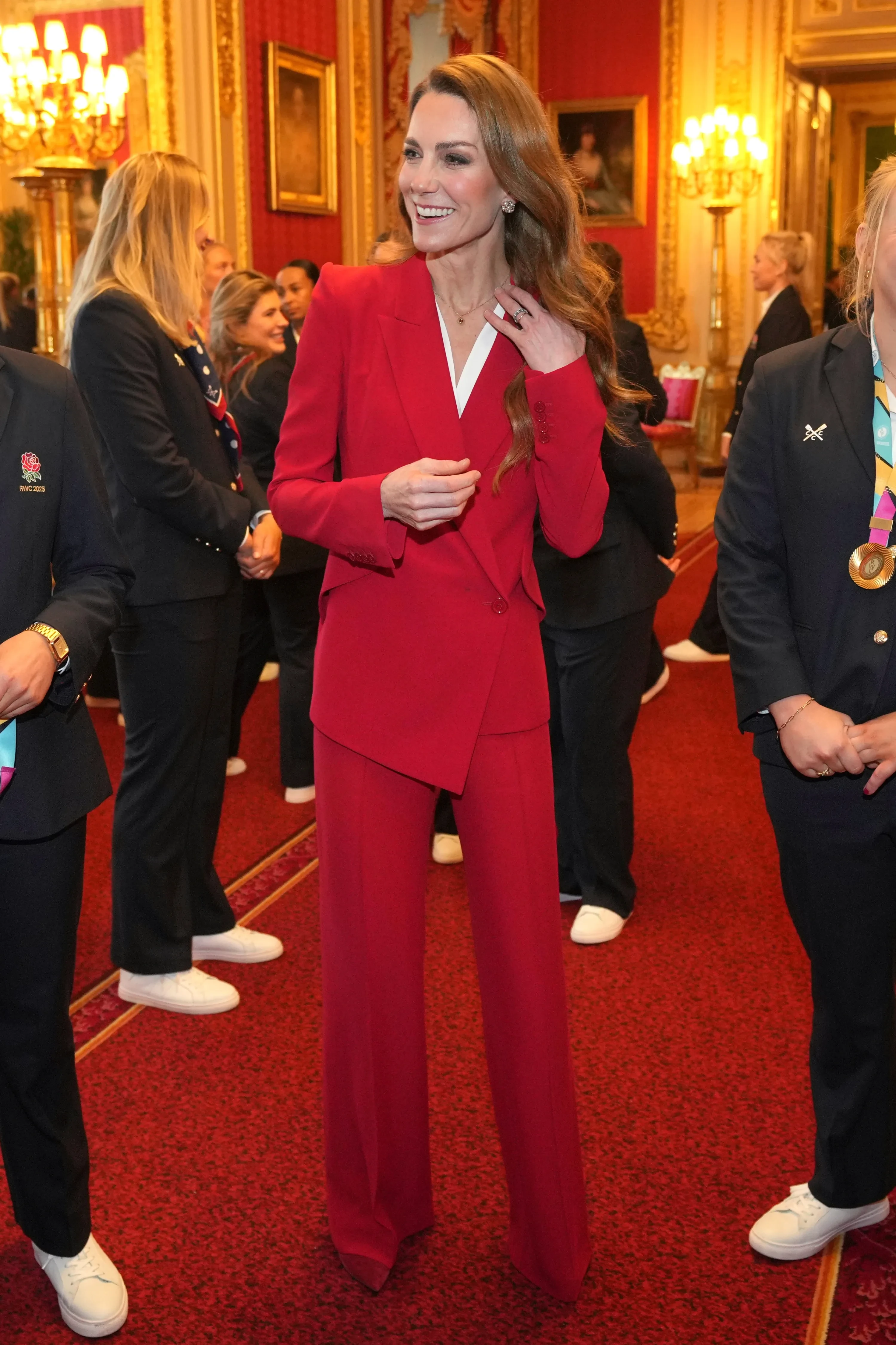 Для мероприятия 44-летняя принцесса Уэльская, вернувшаяся к светлому оттенку волос, выбрала красный брючный костюм от Alexander McQueen. Образ она дополнила туфлями в тон от Giavinto Rossi и ювелирными украшениями. Красный цвет наряда Кейт был не случайным выбором: он символизирует команду "Красные розы", к которой принадлежит женская сборная.