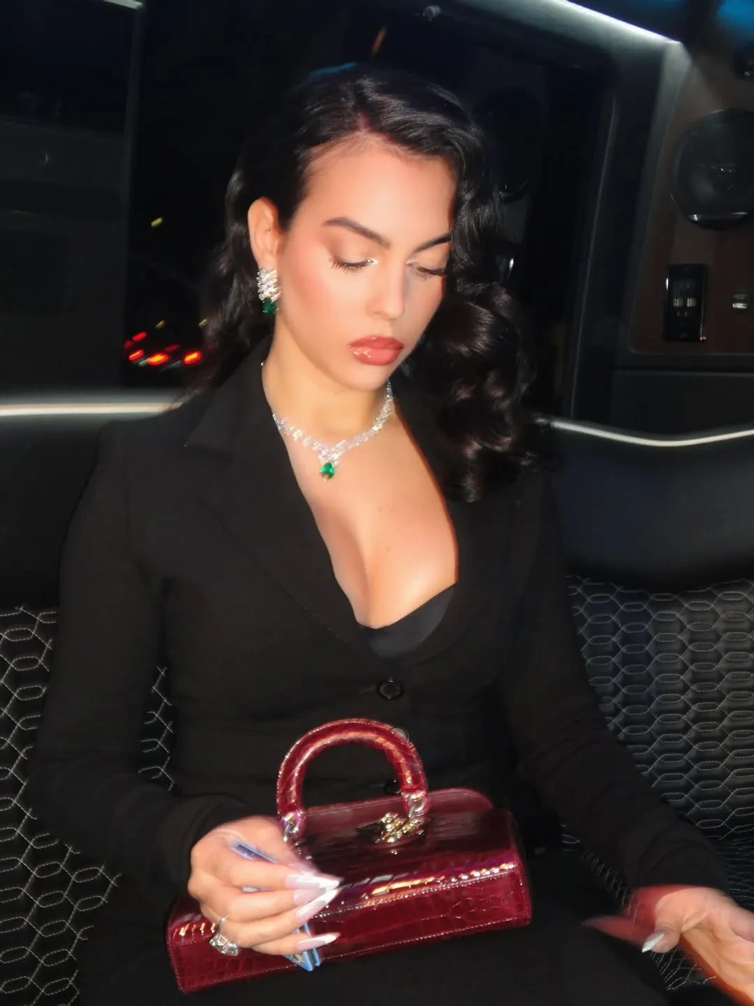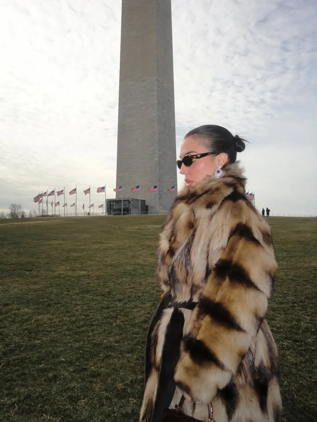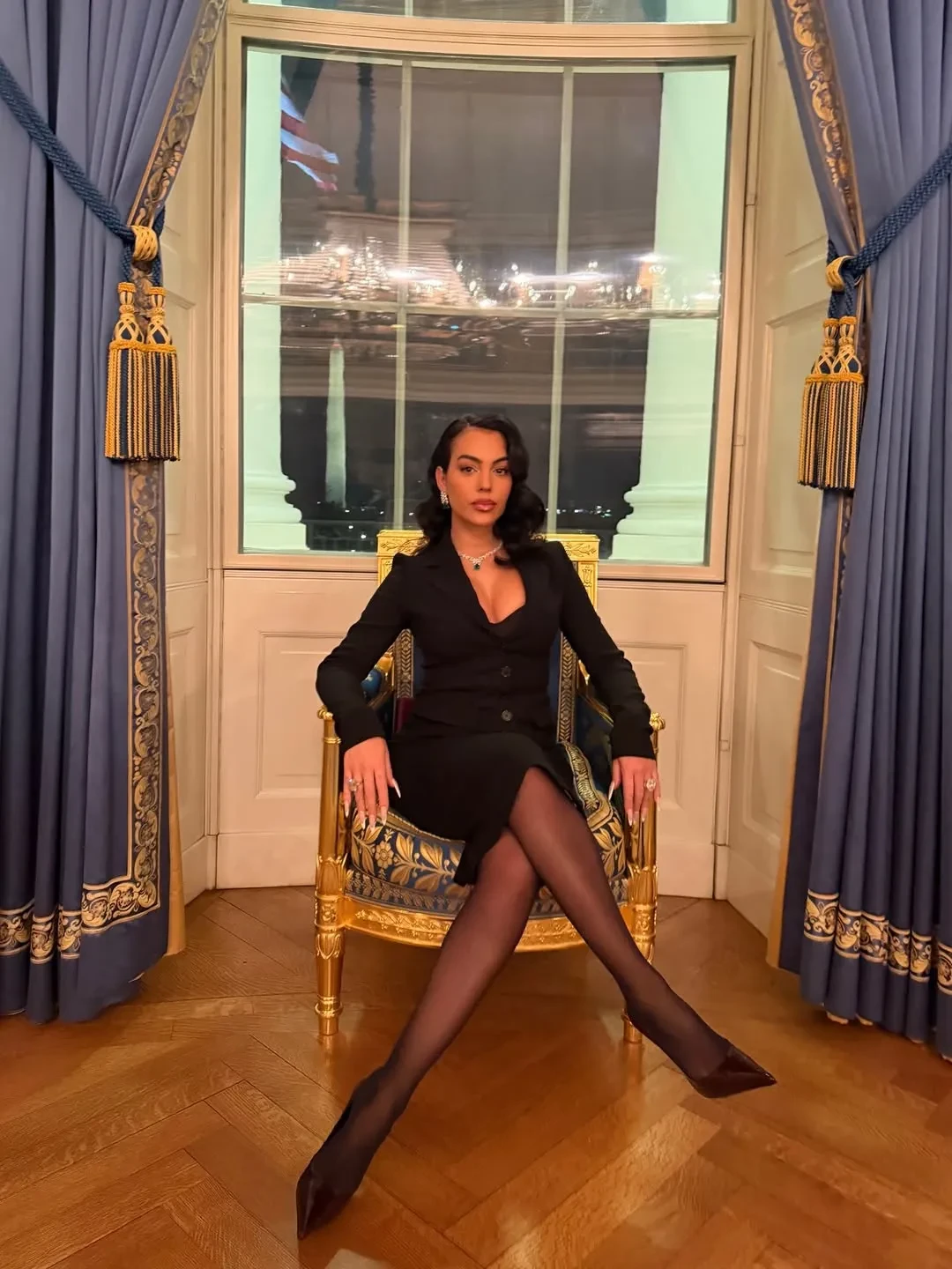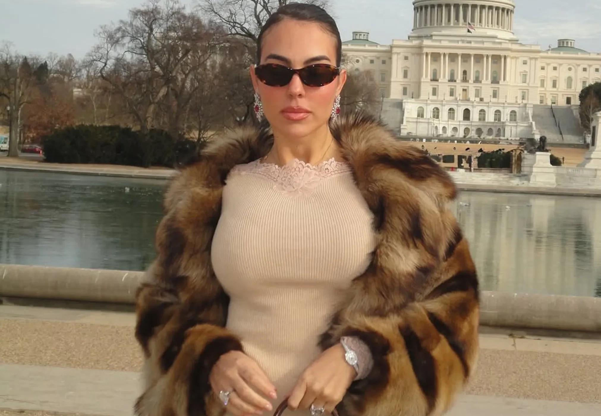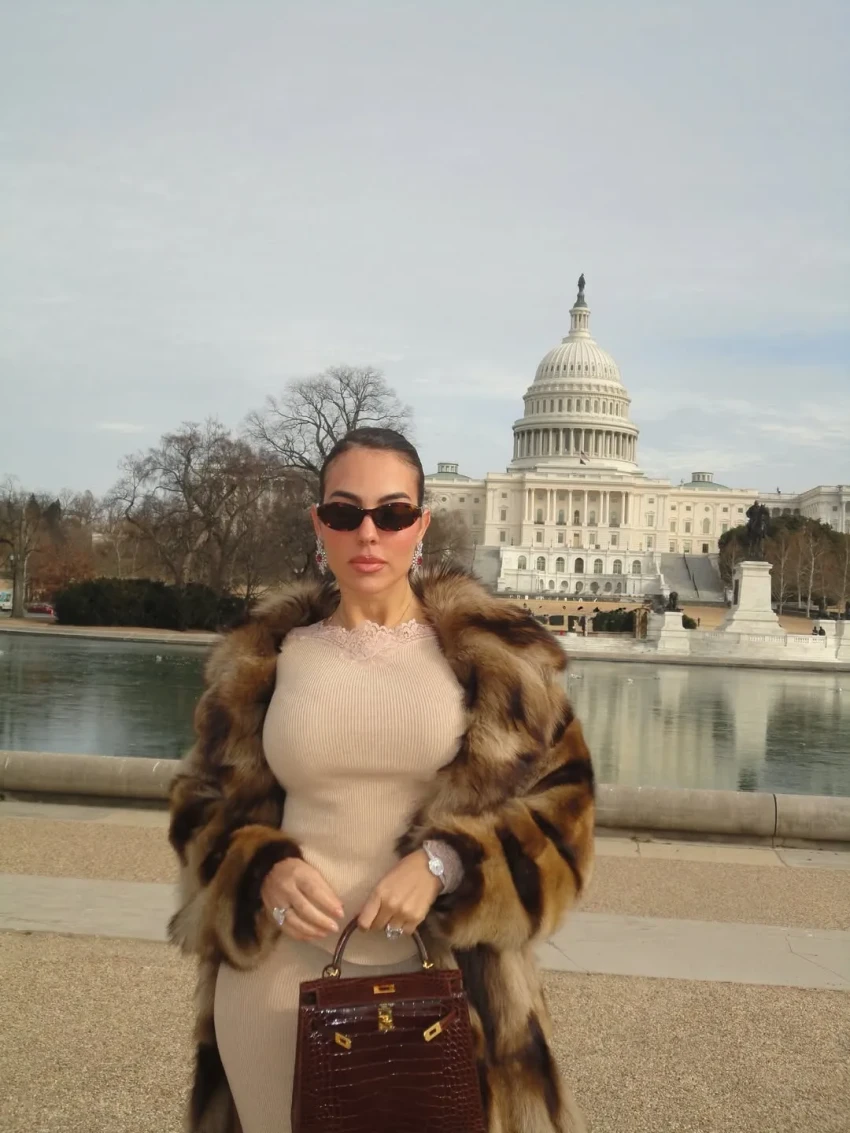 Родригес показала в соцсетях фото из Белого дома, где она позирует в чёрном костюме и в ювелирных украшениях. Среди них, конечно, помолвочное кольцо от Роналду с бриллиантом в 30 каратов. Невеста футболиста прилетела в США на частном джете и, чтобы не замёрзнуть в холодном Вашингтоне, нарядилась в шубу. Её образы дополнили сумки Hermes и бриллианты.