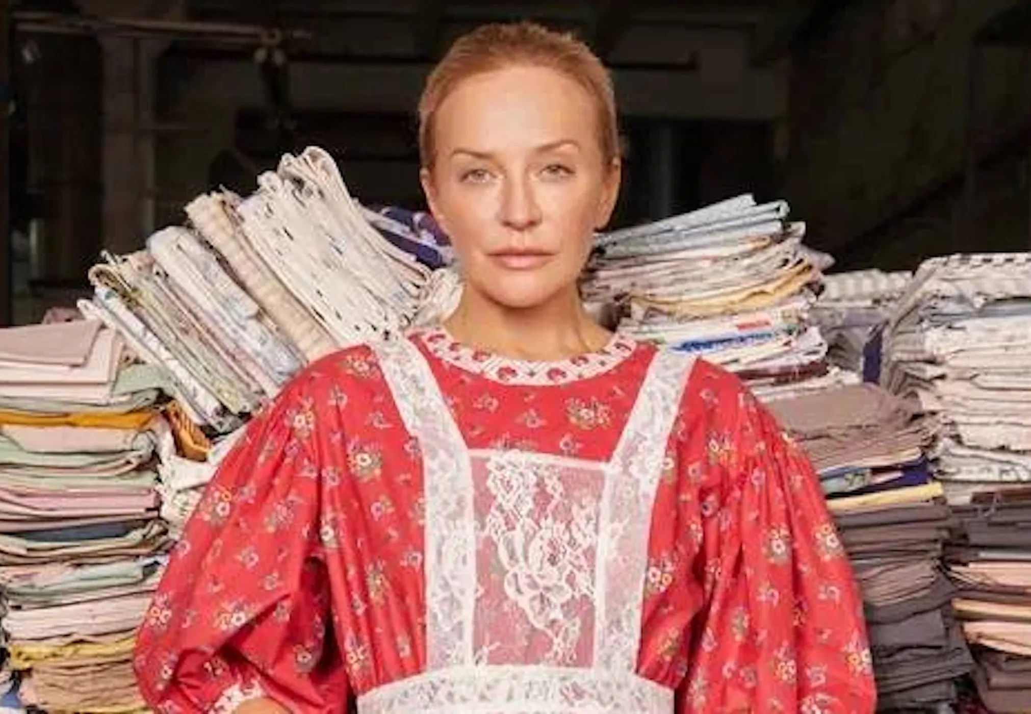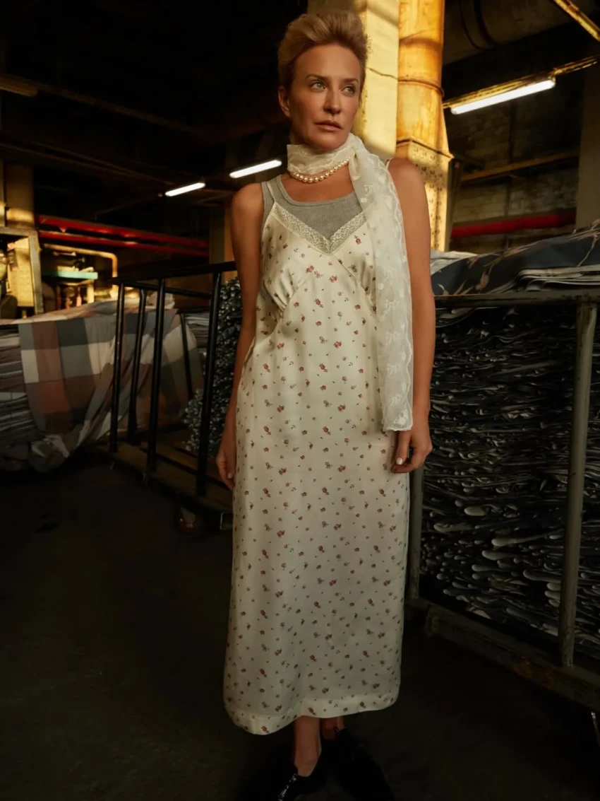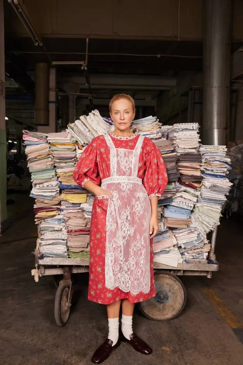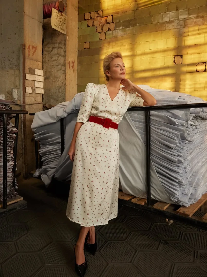 Шелягова примерила фартуки, платья и сарафаны с уникальными принтами, которые были специально отобраны и воссозданы художниками Шуйской фабрики по архивным образцам XVIII—XIX веков и перенесены на современный ситец.