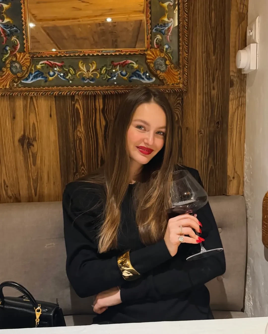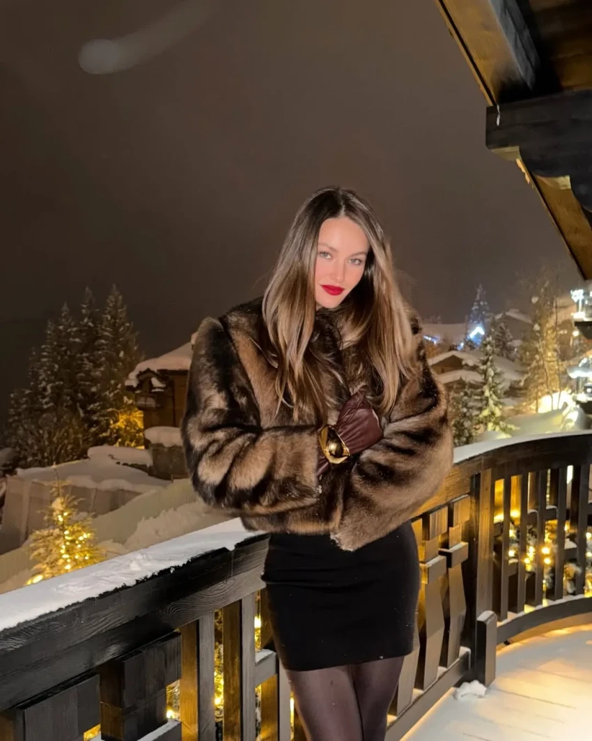 На фото Романова и Доронин позируют перед ужином в ресторане. В честь праздника модель надела короткое чёрное платье, золотой браслет, украшения с бриллиантами и шубу, дополнив образ красной помадой и сумкой Hermes. Она также показала интерьер отеля, в котором остановилась пара, фото в горнолыжных костюмах, праздничный стол с чёрной икрой и подарок от возлюбленного — большой букет красных роз.