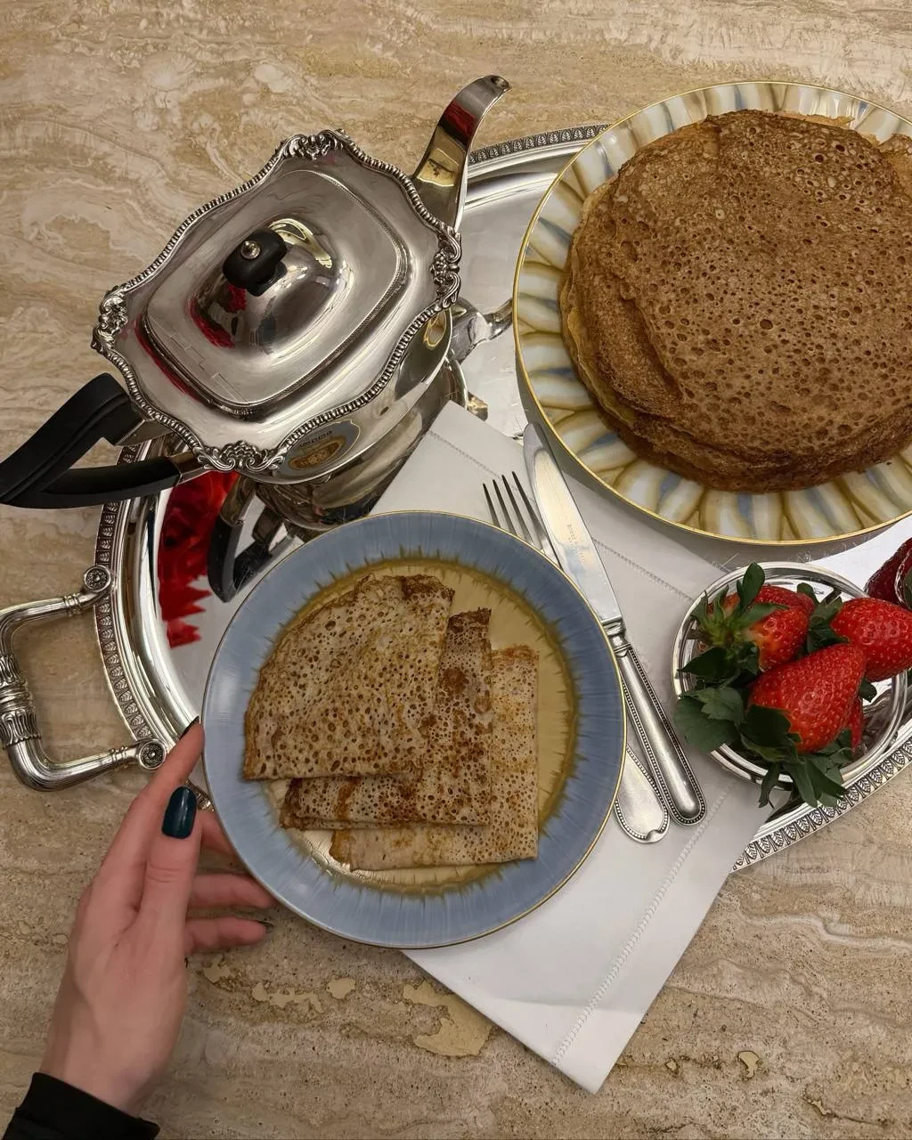 Виктория ШеляговаВиктория ШеляговаФото Виктории ШеляговойФото Яны РудковскойФото Яны РудковскойНаталья Давыдова поделилась своими "ажурными" блинами, которые она готовит на кефире и холодной воде, а подаёт с клубникой на серебряном подносе. Почти бывшая жена Джигана Оксана Самойлова решила не тратить время на готовку блинов дома и заказала доставку, а Виктория Боня еле угодила своей дочери Анджелине, которой предложила сырники, но она хотела драники. В итоге мать и дочь сошлись на блинах.