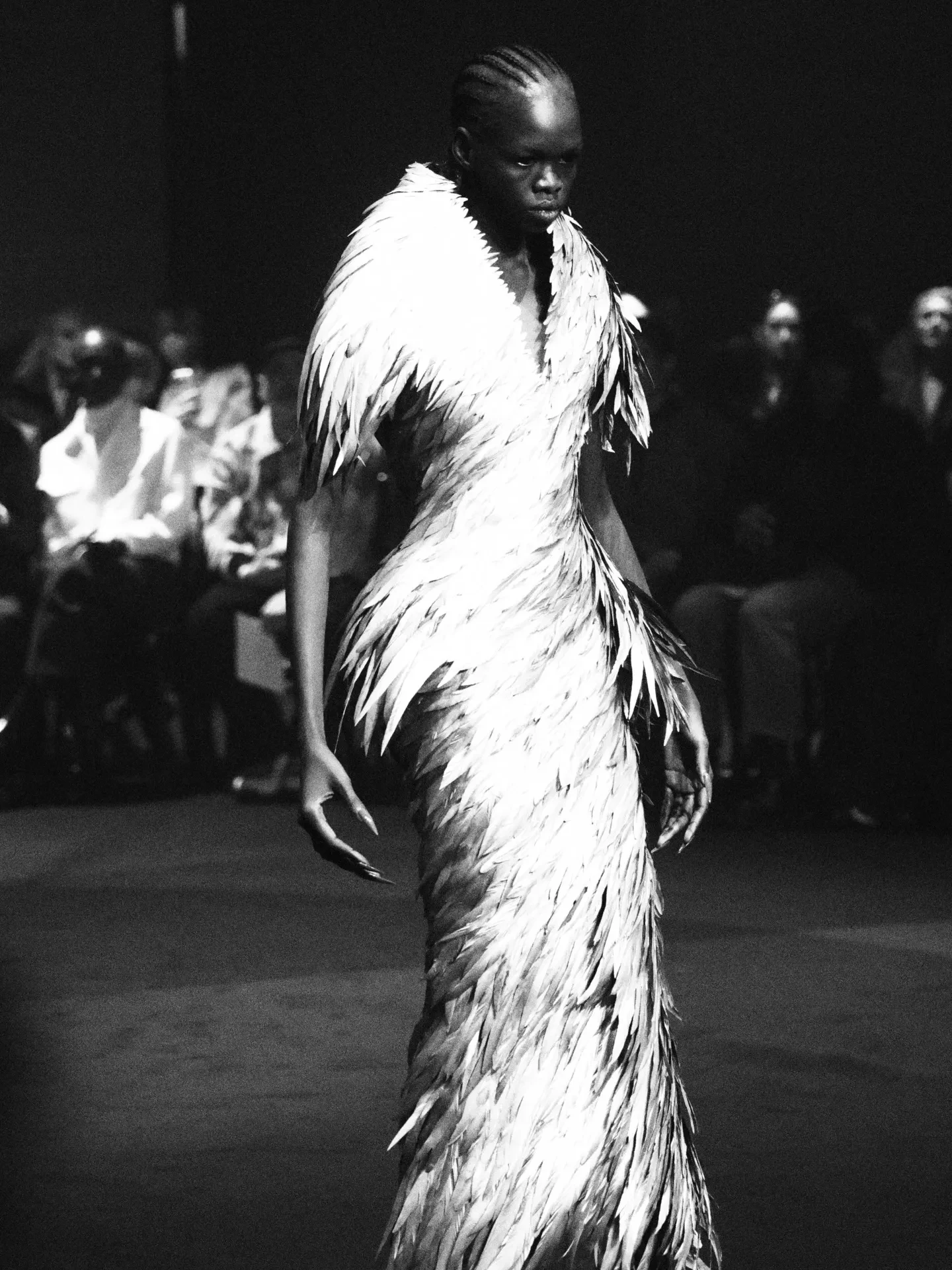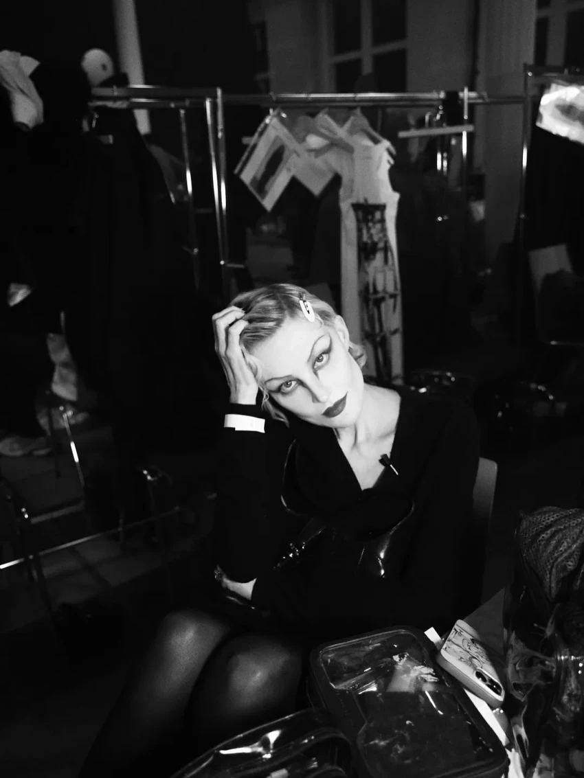 Рената дефилировала в чёрном кожаном жакете с объёмными плечами и плиссированной длинной юбке. Образ дополняли сапоги и перчатки, а финальным штрихом стал макияж в готическом стиле с длинными стрелками и алыми губами.