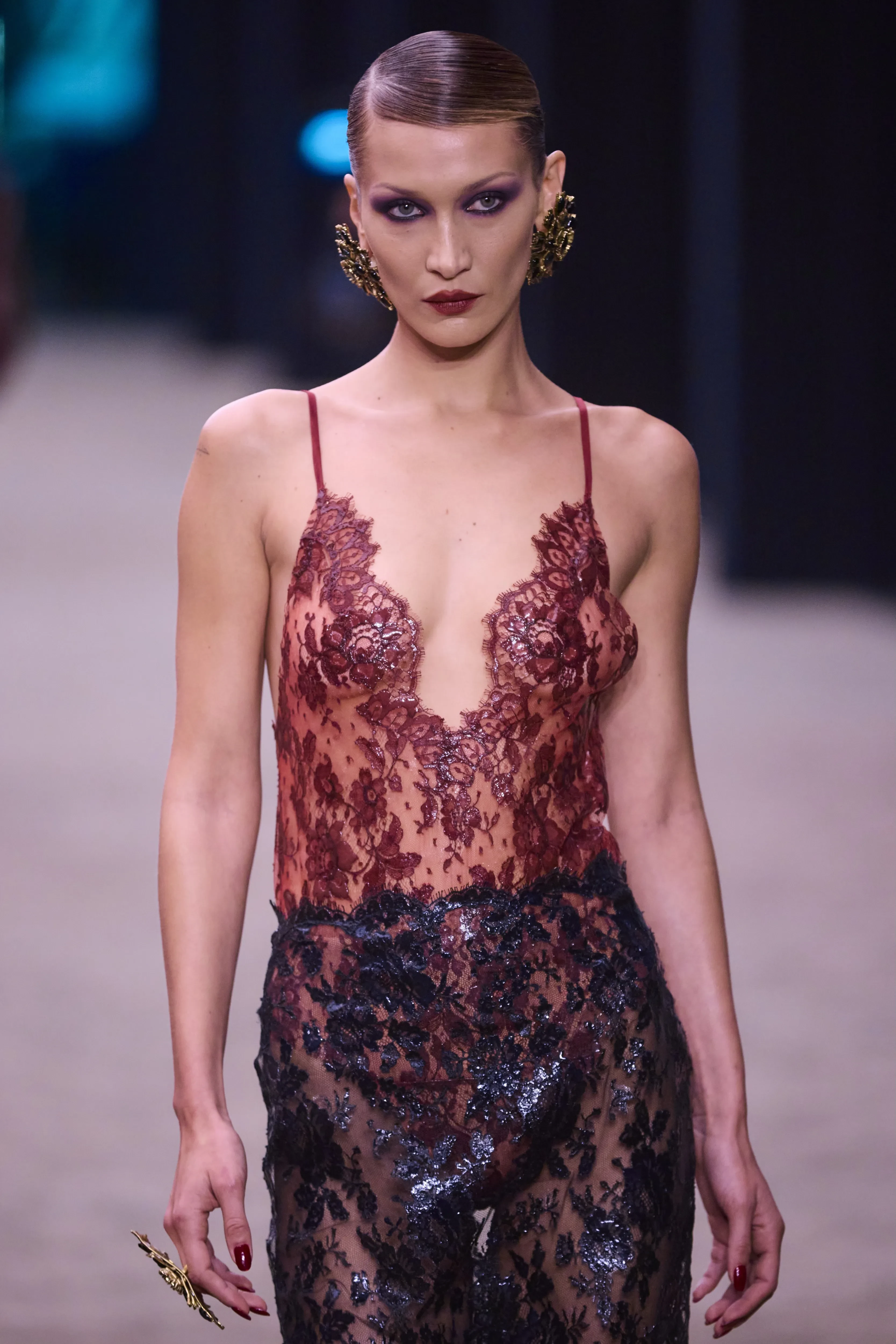 РозэНа подиум на показе осенней коллекции Saint Laurent вышла Белла Хадид в наряде с декольте. В шоу также приняли участие российские модели Алина Миллер и Таня Чурбанова.