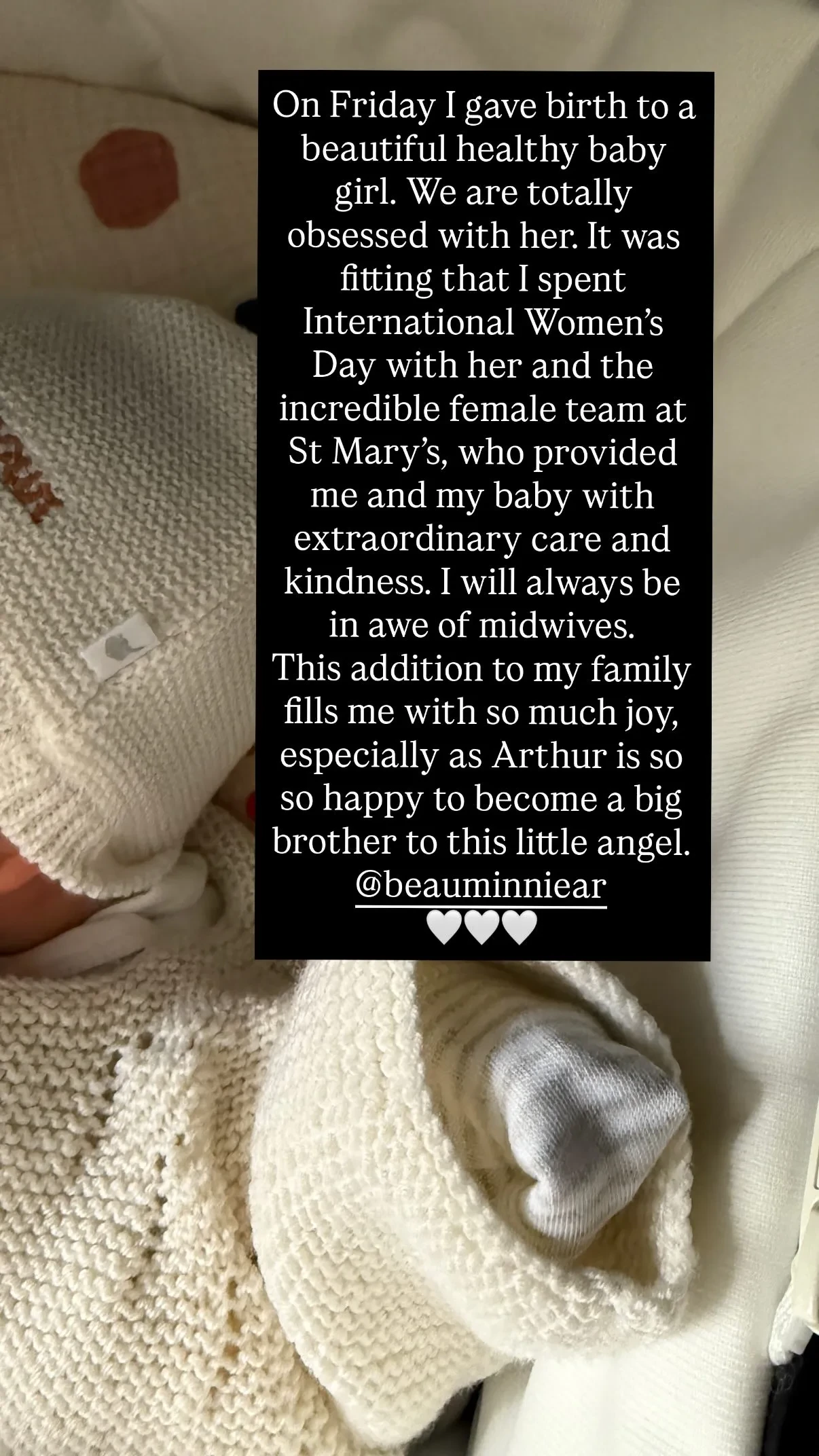"В пятницу я родила прекрасную здоровую девочку. Мы без ума от неё, — поделилась исполнительница. — Было символично провести Международный женский день с ней и невероятной женской командой в больнице".