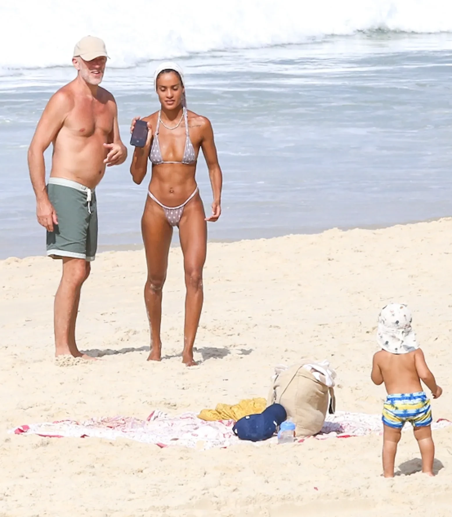 На снимках 29-летняя Нара Баптиста и французский актёр отдыхают с ребёнком на берегу океана. Модель позировала возлюбленному на камеру в бикини, пока их сын находился неподалёку. Позже семью также видели во время купания.