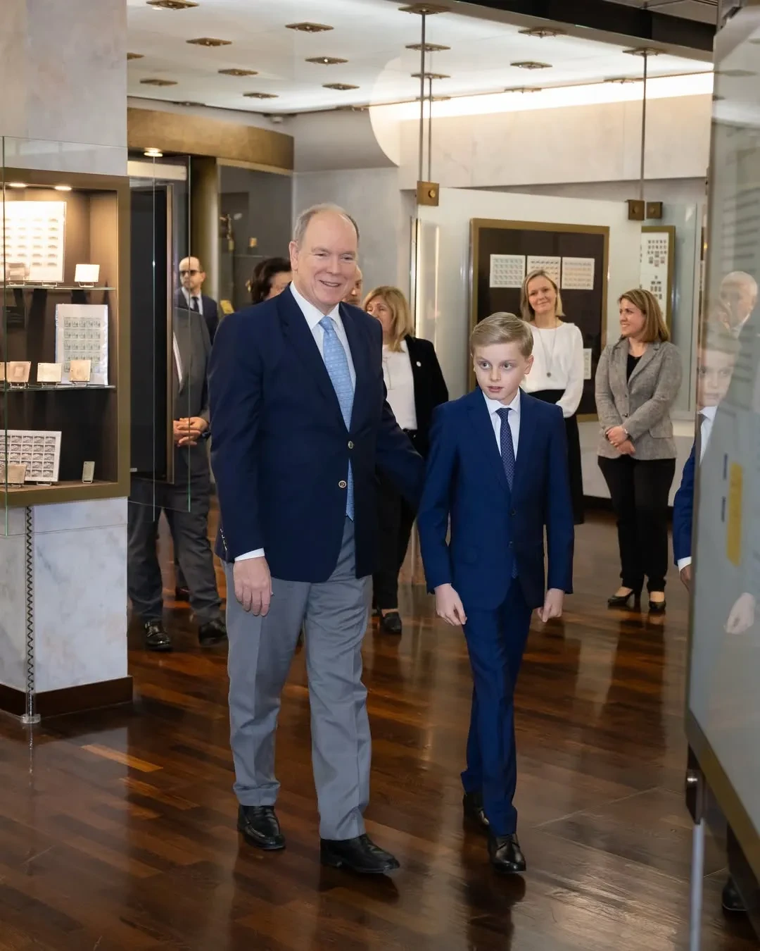 Правящий князь карликового государства и его сын осмотрели выставку в честь 30-летия музея, экспонатом которой стала в том числе памятная марка с изображением Грейс Келли. Оба позировали рядом с ней для фотографов.