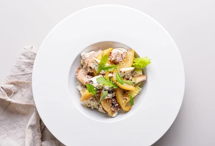 Этот салат — настоящая симфония вкусов: сочная груша, нежная пастрами из индейки, а также сыр с голубой плесенью и ароматная апельсиновая заправка.