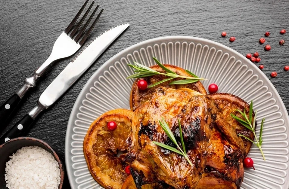 Смешай соевый соус с мёдом, чесноком и специями. Обмажь утку и нафаршируй апельсинами. Запекай при 180°С 1,5 часа до золотистой корочки.