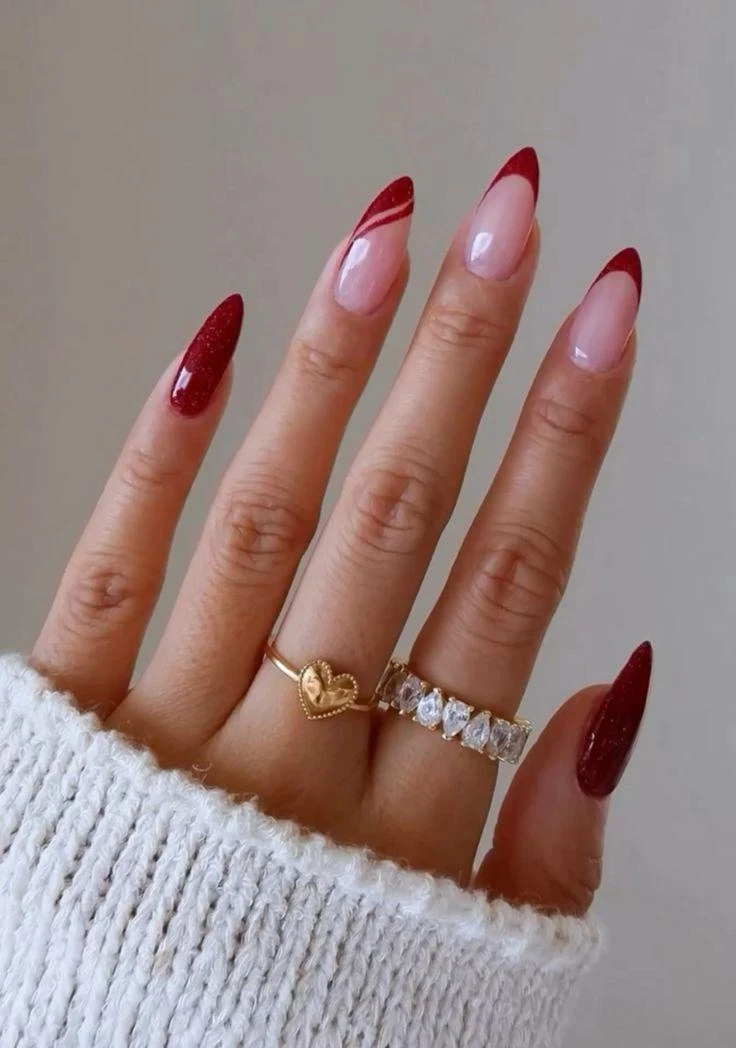 Классический френч легко обновить, заменив белый кончик на алый, оттенок «чили» или глубокий винный.