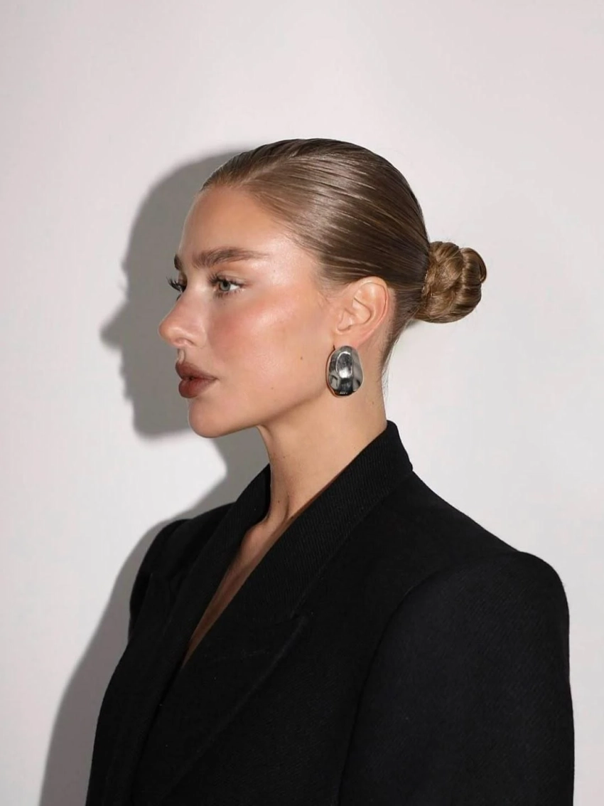 Низкий пучок — один из самых недооцененных способов подчеркнуть скулы. Он формирует спокойную линию шеи и переносит внимание в среднюю треть лица. Открытые уши «очищают» боковые зоны, и взгляд автоматически поднимается вверх.