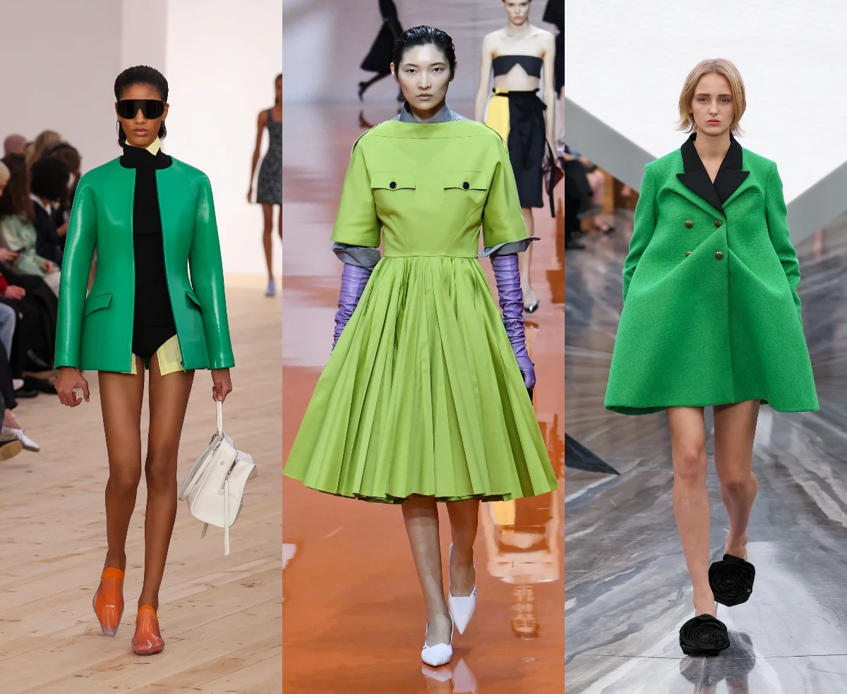 У Dior ярко-зеленый появляется в архитектурных пальто, у Loewe — в виде выразительных акцентов на фоне монохрома. Это цвет обновления, энергии и внутренней гармонии.