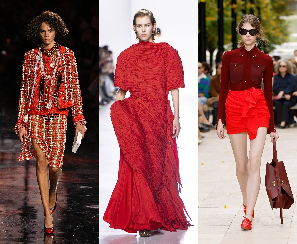 На подиумах красный звучит многоголосо: Chanel показывает его в твидовых костюмах и аксессуарах, Bottega Veneta — в роскошных вечерних платьях, Celine — в деталях с легким рок-настроением.