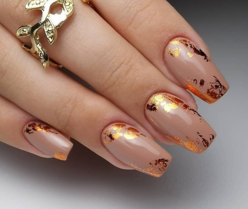 Нюдовый маникюр можно разнообразить, добавив блеск и поталь. Блестки можно наносить по всей длине ногтя в хаотичном порядке или создать узоры, делая акцент сверху, снизу или сбоку. Поталь, имитирующая сусальное золото, особенно эффектно будет смотреться на длинных ногтях миндалевидной формы.