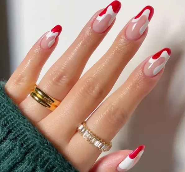 Абстрактный дизайн, напоминающий шапку Деда Мороза или сладкую карамель, оставляет простор для фантазии. Яркие оттенки делают этот маникюр веселым и необычным.