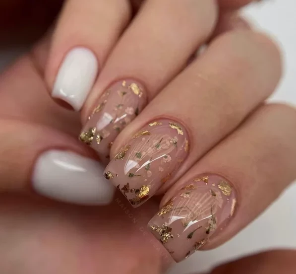 Для маникюра в стиле шебби-шик прекрасно подходят золотые фольга и блестки. Они создают эффект благородной потертости, который является визитной карточкой этого стиля. Дополнить дизайн можно использованием сухоцветов – нежные лепестки в сочетании с золотом и пастельными тонами смотрятся особенно изысканно.