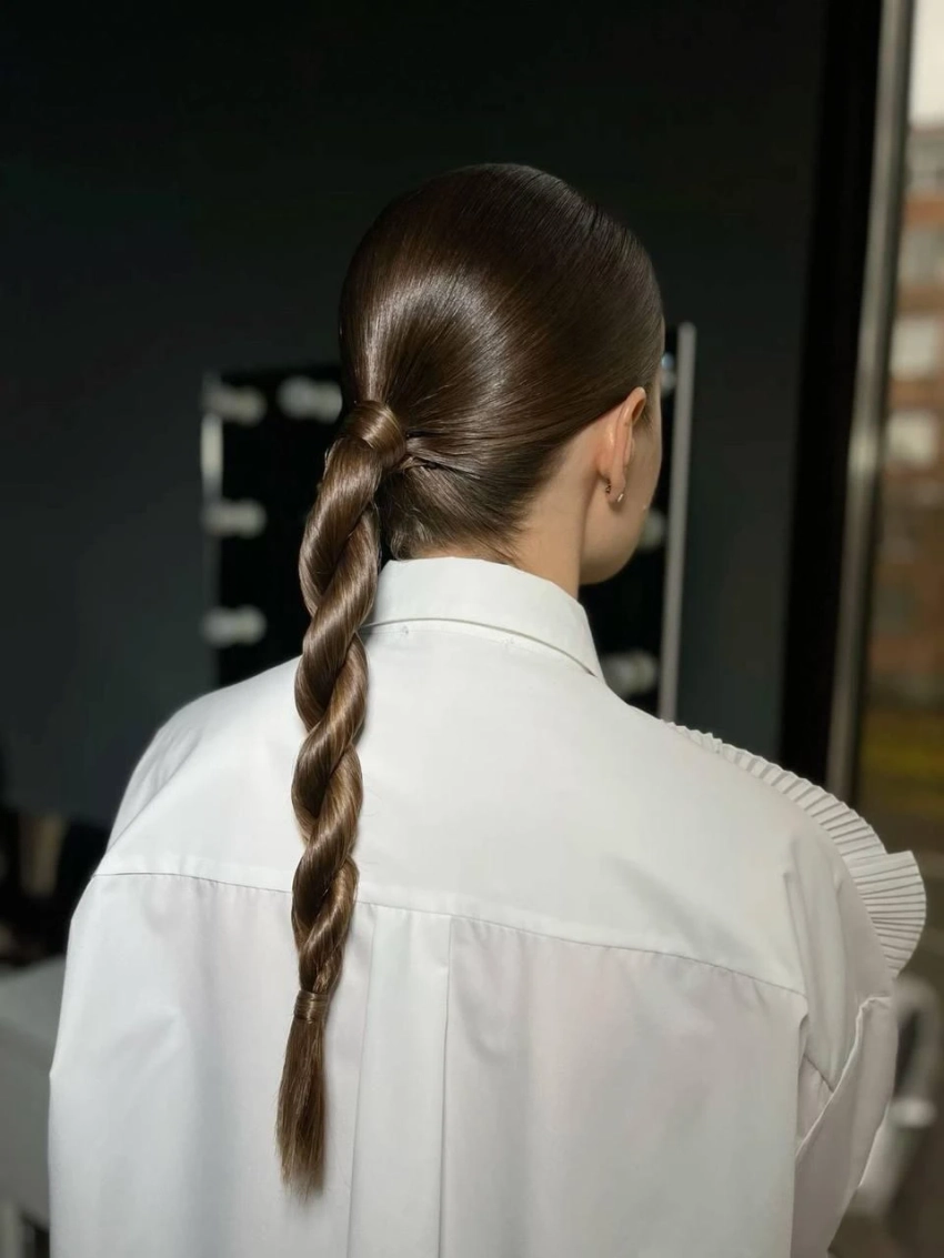 Строгая и собранная укладка, которая держится весь день. Ее можно плести по центру или на бок — в любом случае получится элегантно.