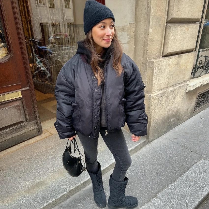Самый актуальный вариант — укороченные дутики на толстой подошве в базовых оттенках: белом, сером и черном. Они идеально смотрятся с объемными пуховиками, парками и спортивным стилем.