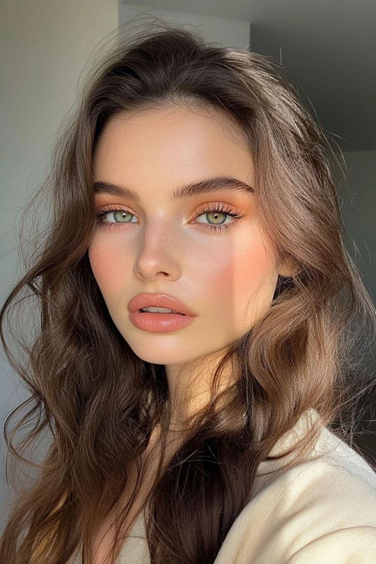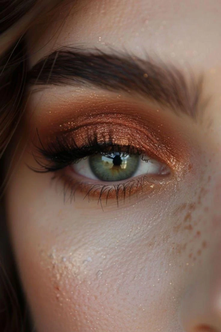 Забудьте о драматичных черных смоки-айс — теперь в моде мягкая дымка в бронзово-медных тонах. Такой макияж выглядит естественно, подчеркивая глубину взгляда.