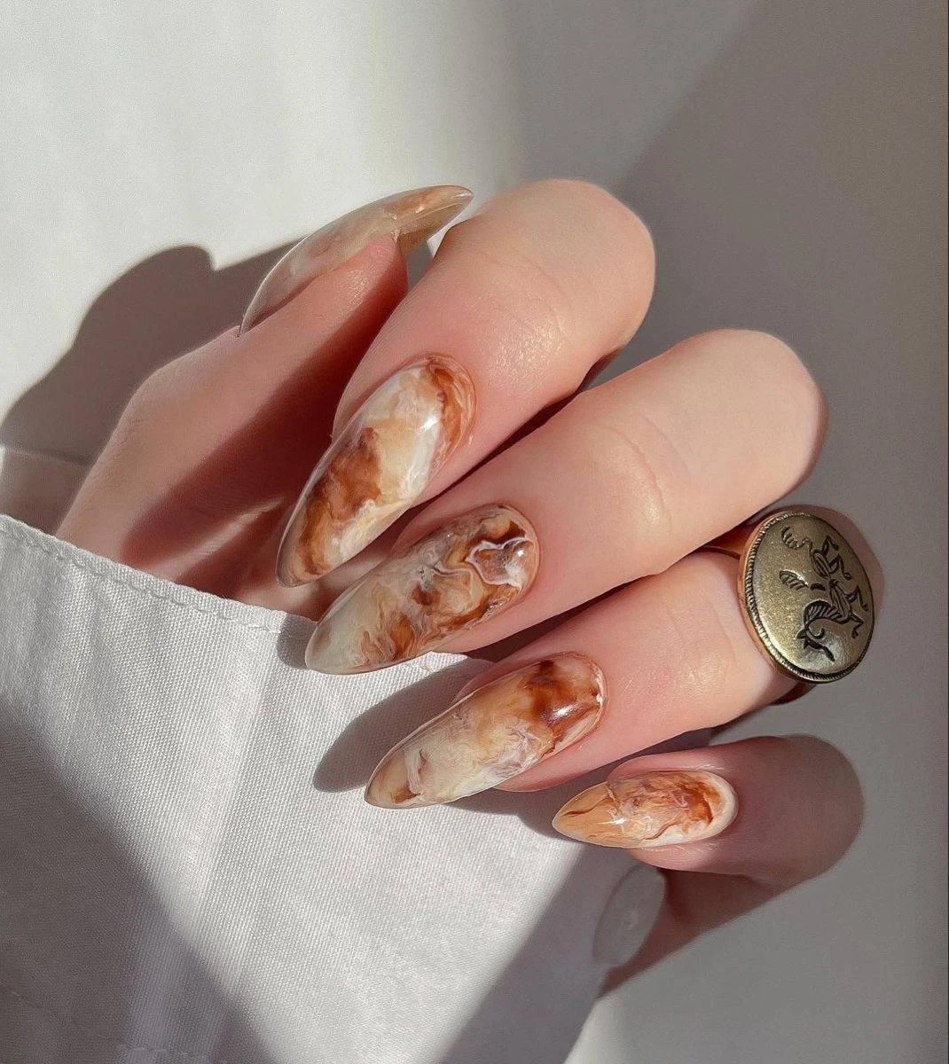 Карамельный мрамор гармонично смотрится как с уютным свитером и джинсами, так и с элегантным шелковым платьем, делая образ завершённым. В октябре, когда природа сама демонстрирует богатую палитру теплых оттенков, такой маникюр — простой и стильный способ соответствовать сезону.